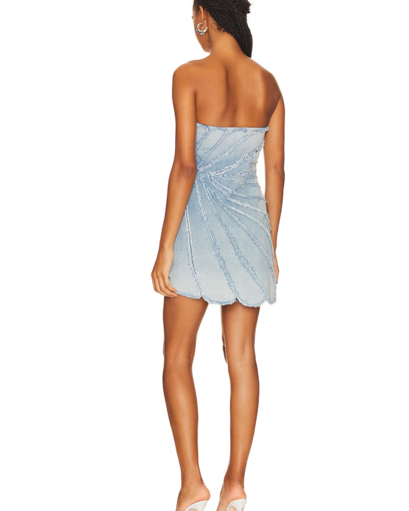 Light wash denim strapless mini dress with denim butterfly looking design cute for game days and any formal country event!