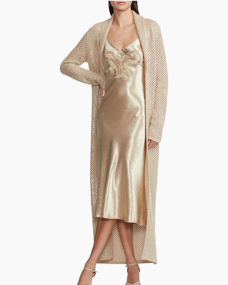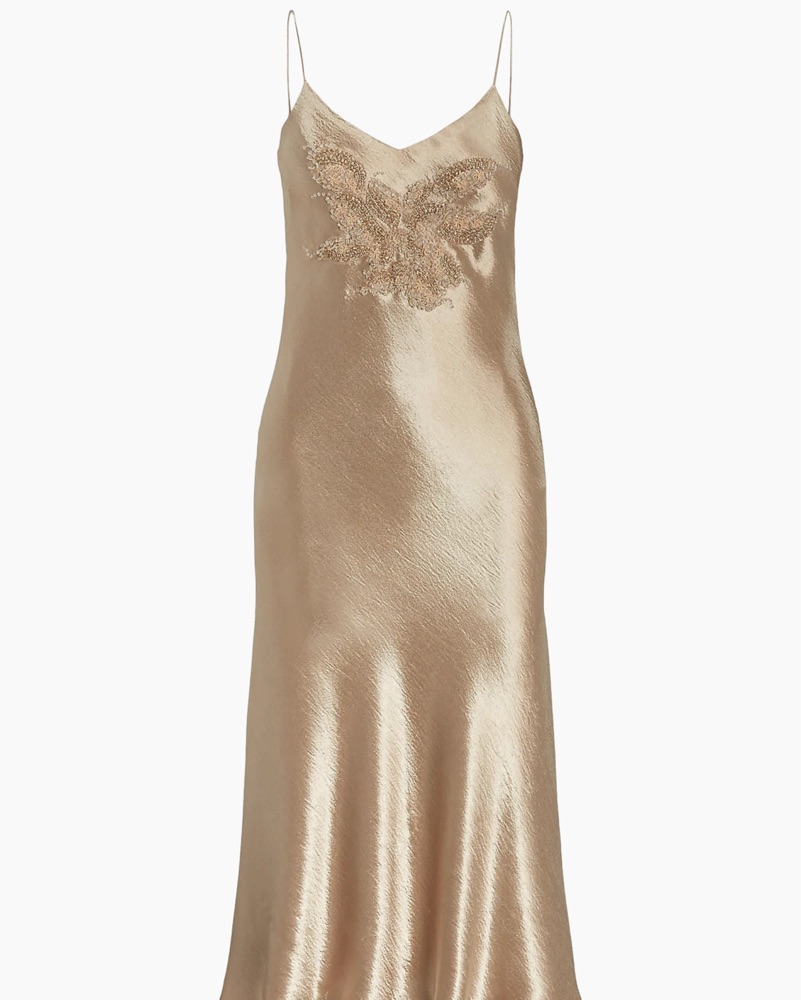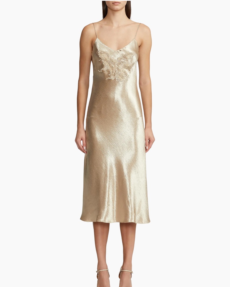 This stunning Ralph Lauren Purple Lable gold satin slip dress is perfect for a glamorous evening event. The flowing silhouette and delicate lace detailing create an elegant and refined look.