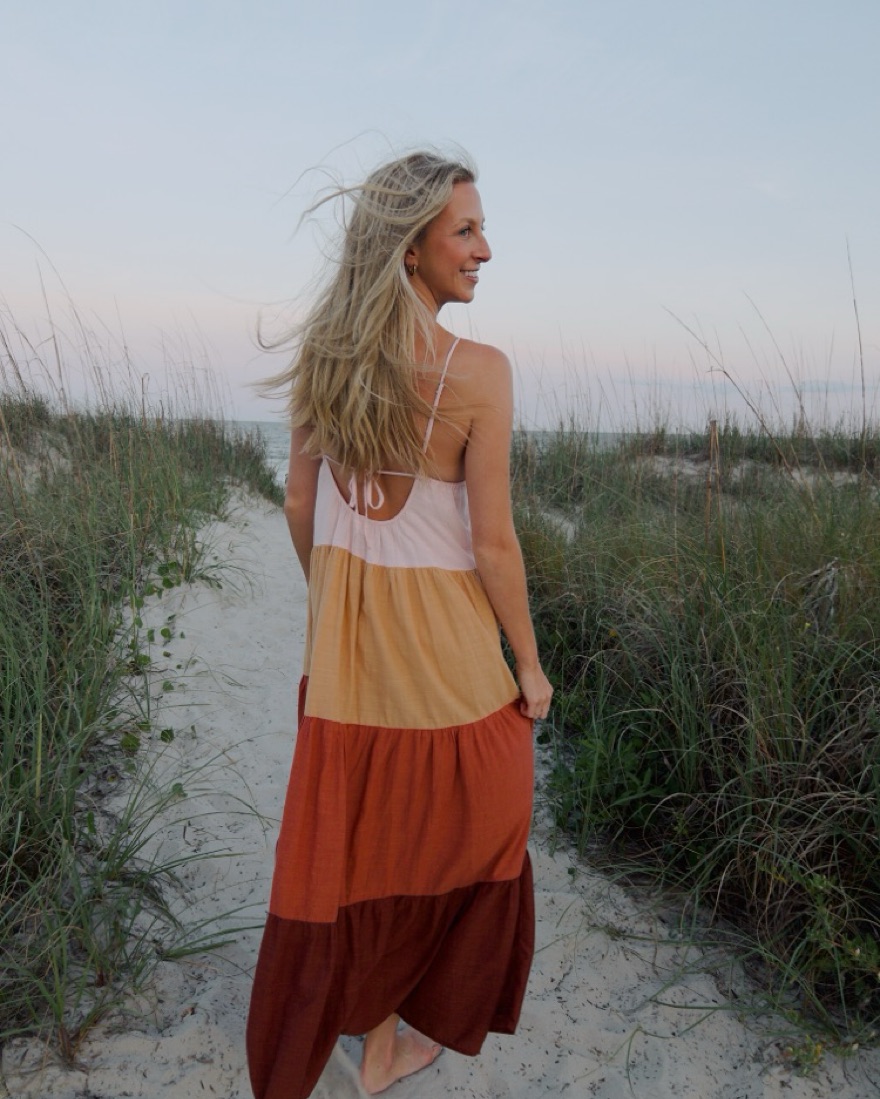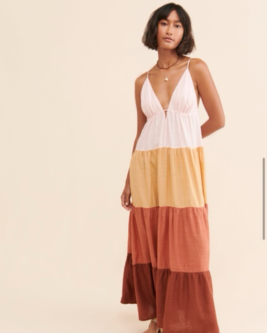 This breezy maxi dress is perfect for a summer beach day or outdoor event. The playful color-blocking and flowing silhouette create a fun, effortless look.