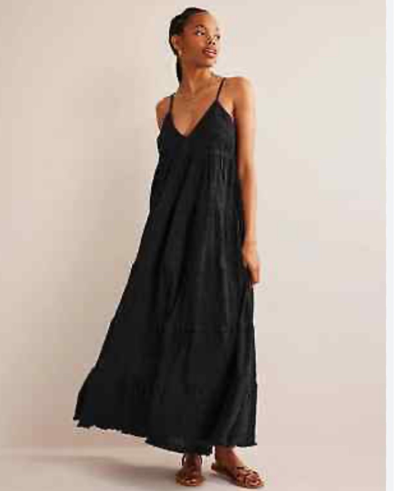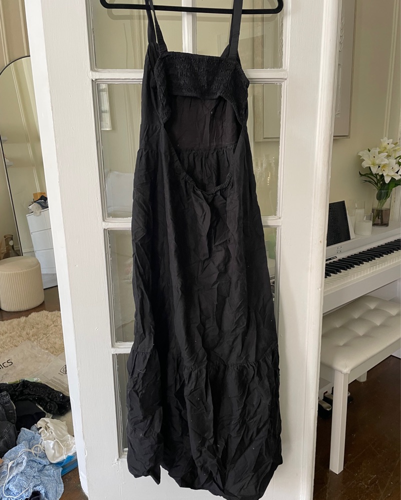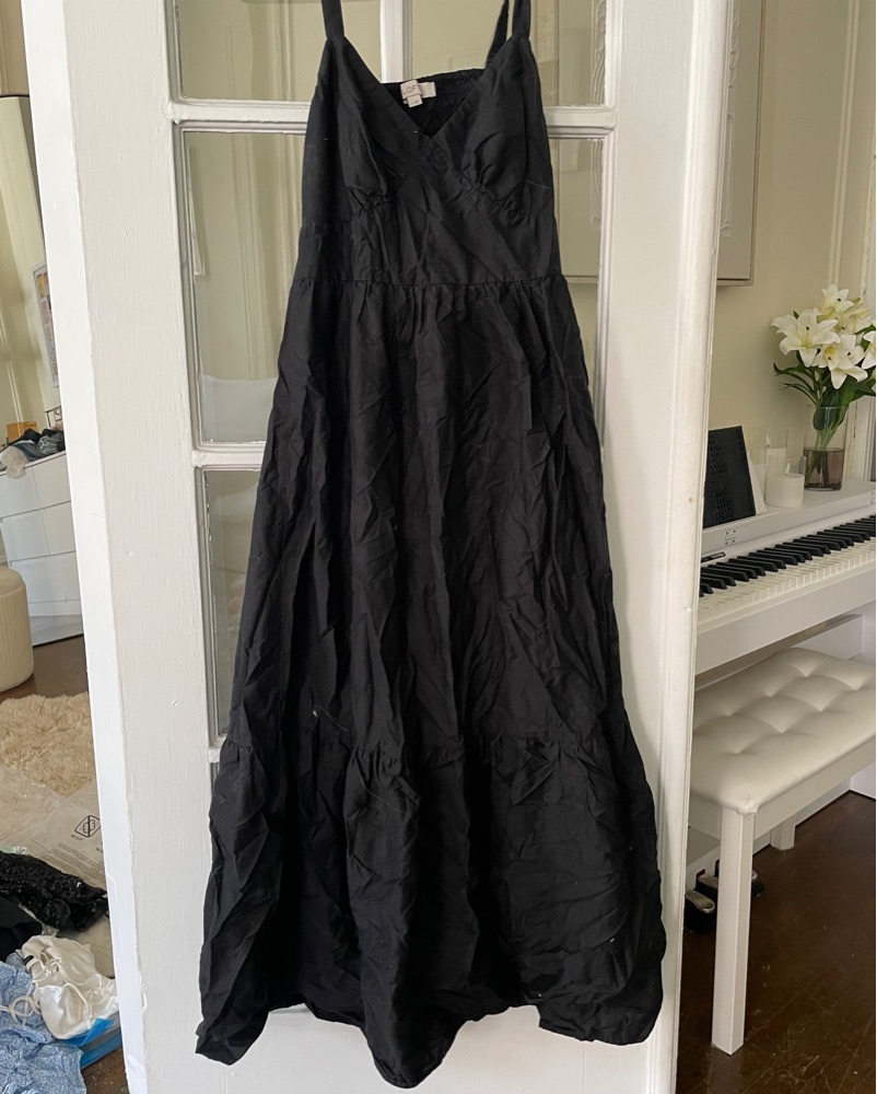 This chic black maxi dress is perfect for a formal event or special occasion. The flowing, billowy silhouette creates a flattering and sophisticated look.