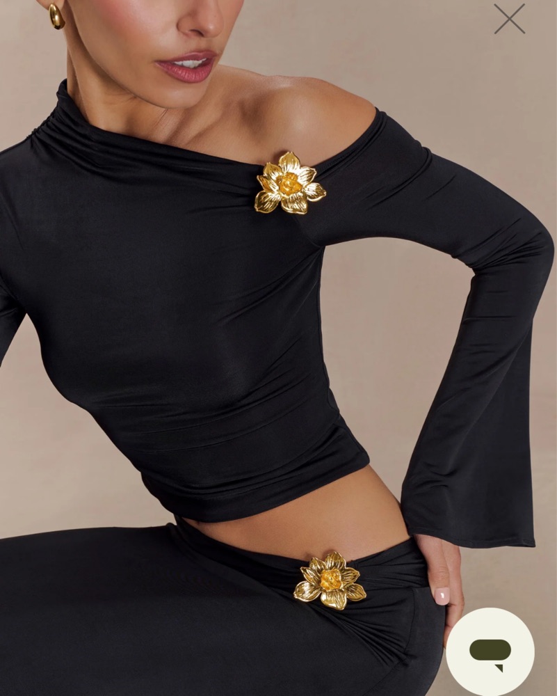 Black off shoulder top with gold flower hardware XS