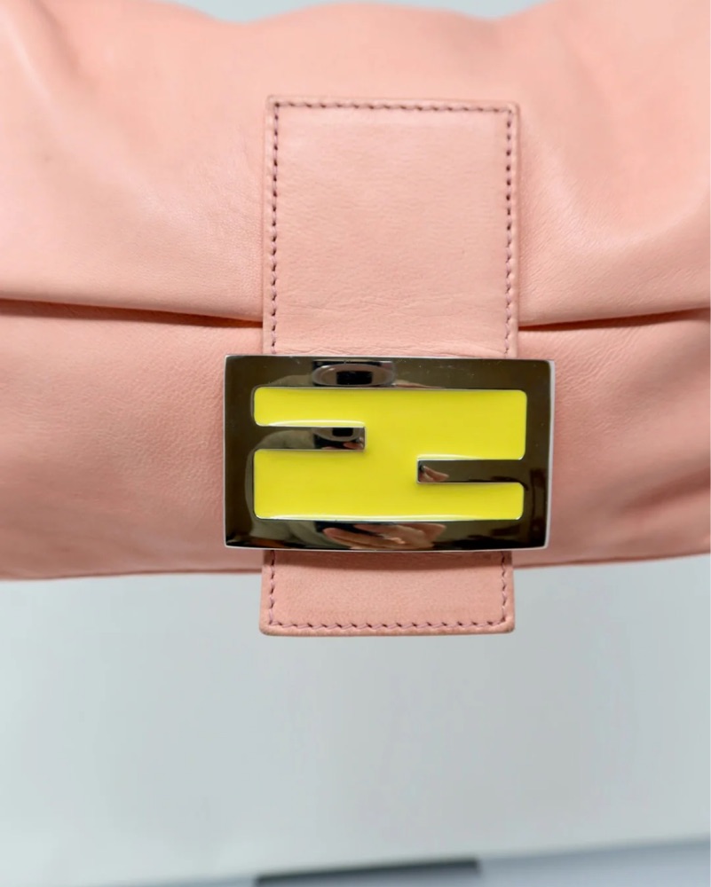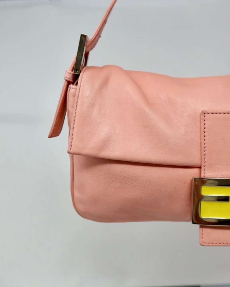 This stylish blush Fendi Baguette bag is perfect for everyday wear or dressier occasions. Its roomy interior and adjustable strap make it a versatile choice.
