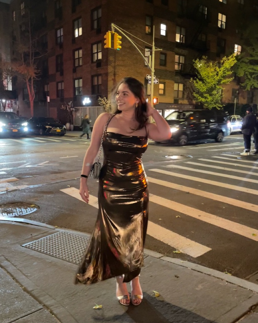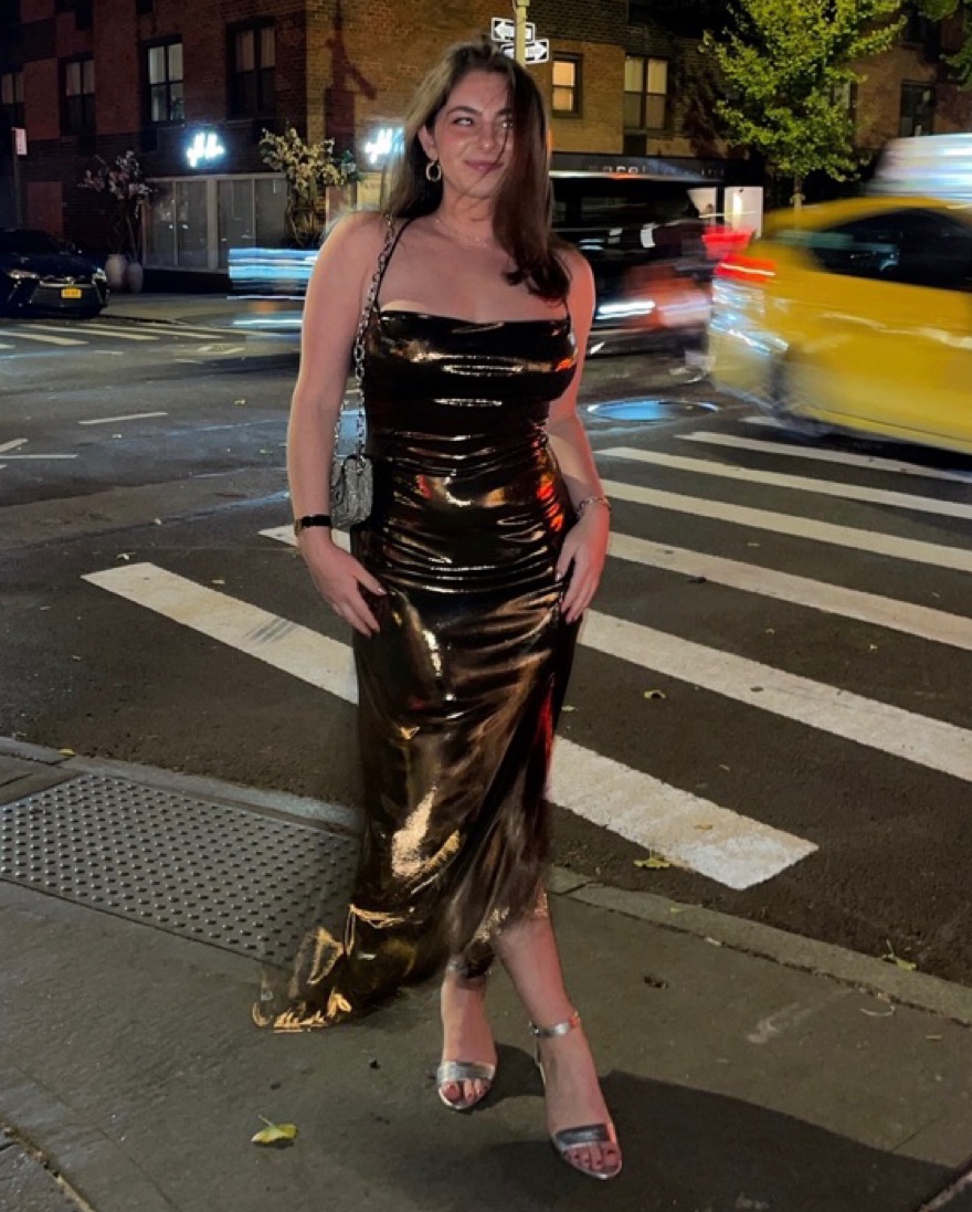 You're a bronze goddess in the Gaia dress. It features a high-shine metallic bronze finish. Cowl neckline leads to a fitted bodice and side slit accent. Cross strap back.