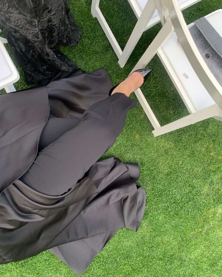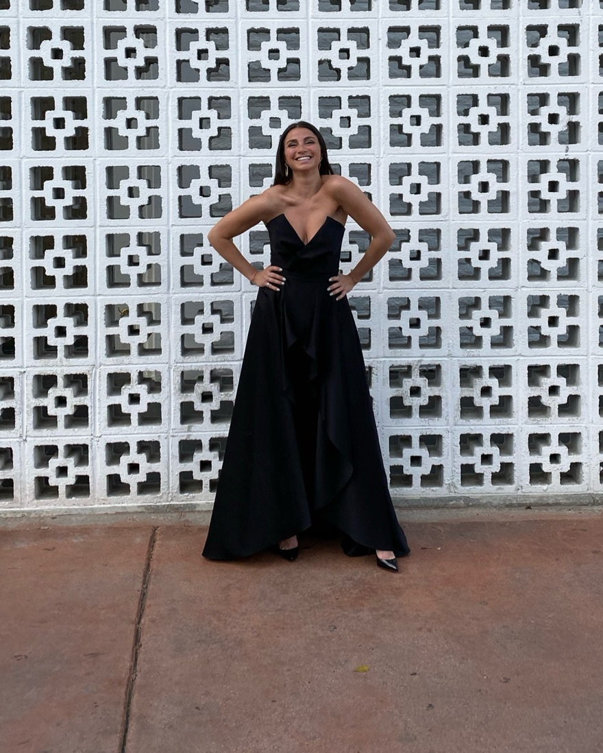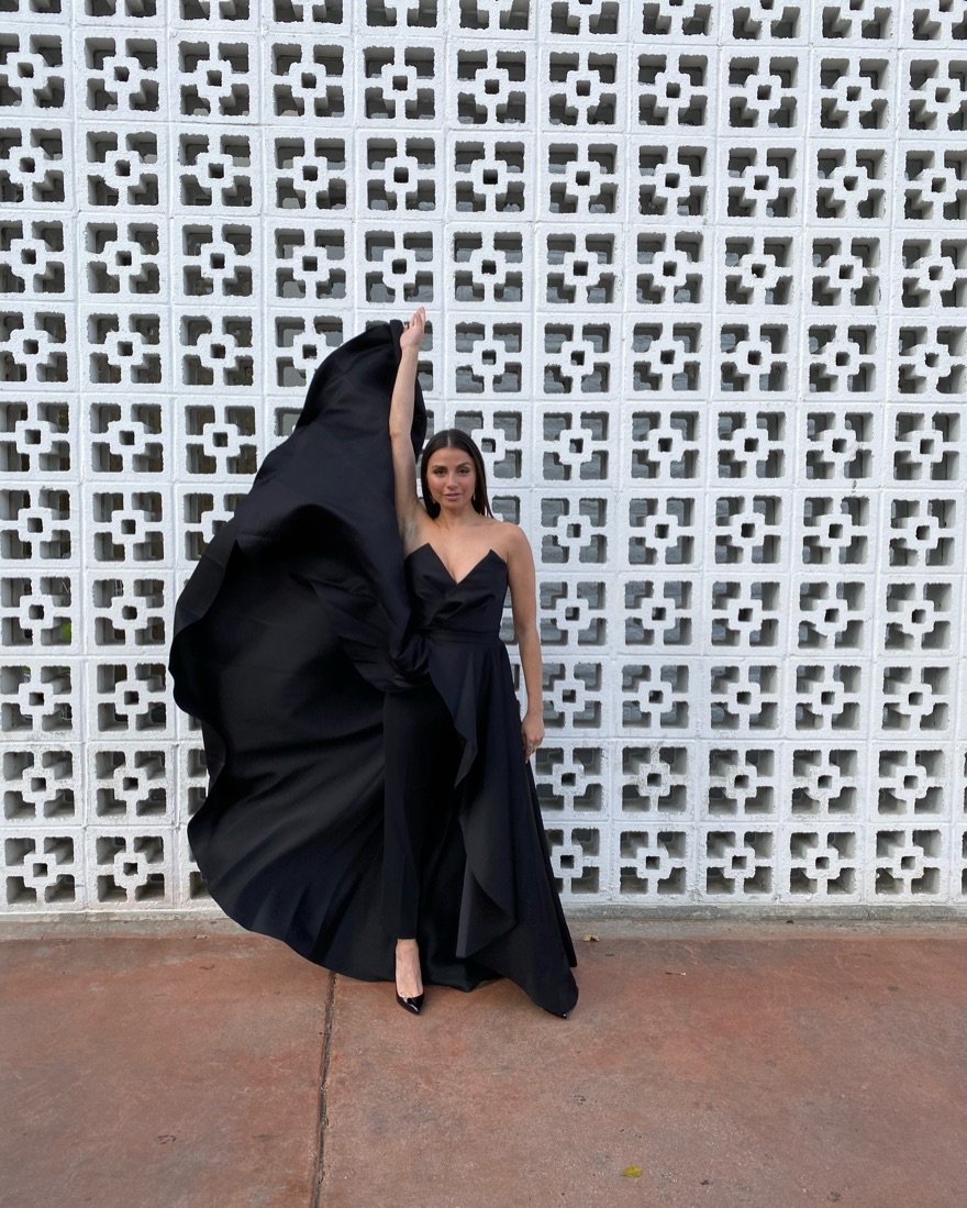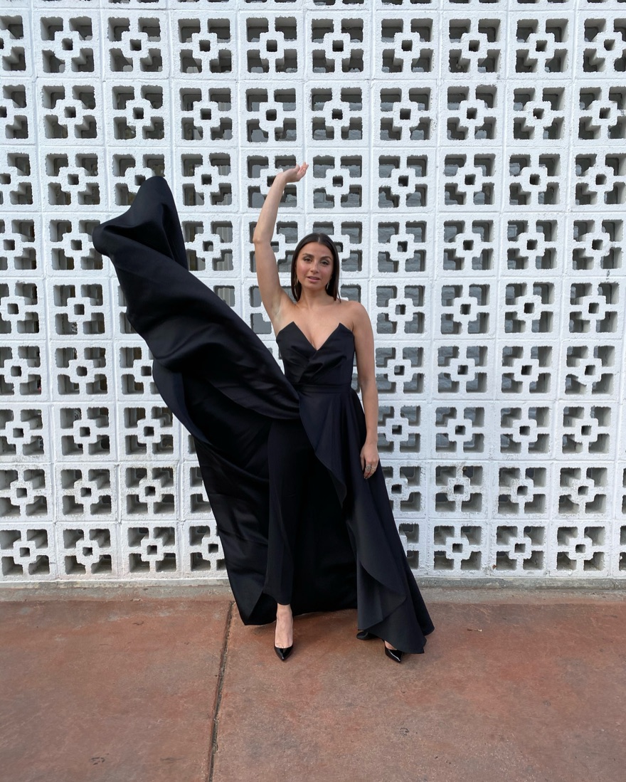 The most amazing dress I’ve ever worn. It’s a strapless jumpsuit with a fully removable skirt. Jumpsuit has a little cigarette/ skinny leg and skirt has a slit up the middle. Truly stunning, only worn once