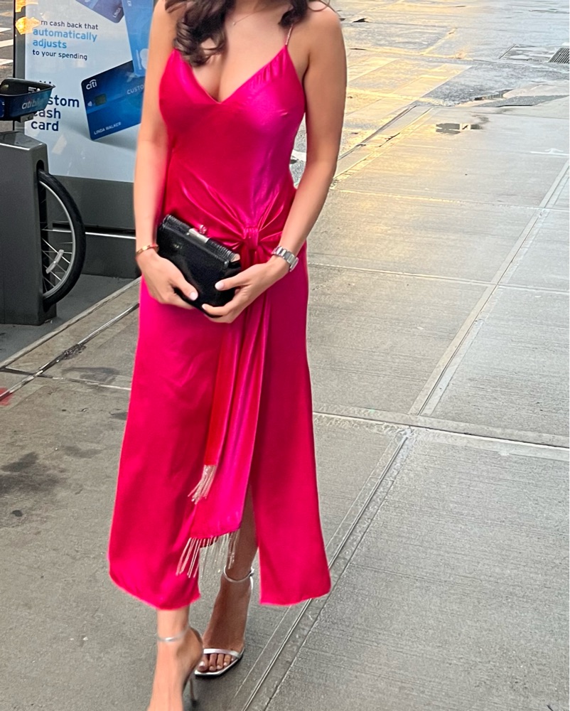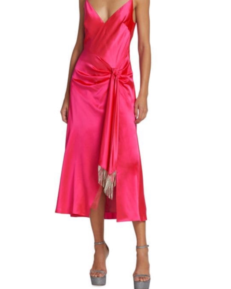 Gorgeous pink silky evening dress with sequin straps and a tassel.