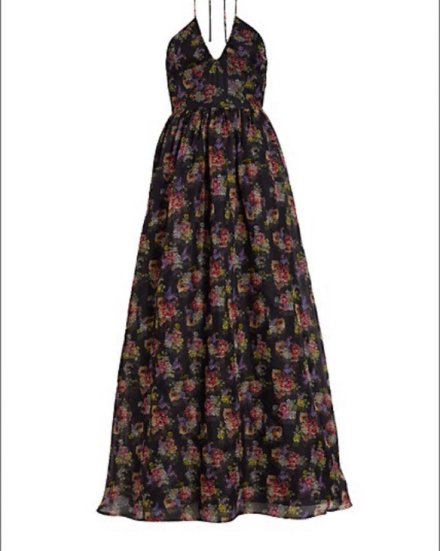 A&O floor length gown, black floral pattern, perfect for wedding guest/black tie event!