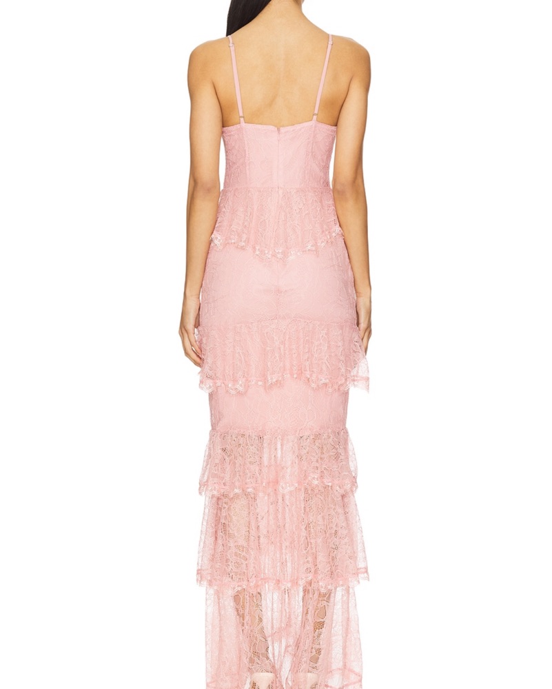 This romantic, light pink dress is perfect for a wedding, special occasion, formal, or summery event. The pastel pink lace and tiered design create a flattering, elegant silhouette. This Zelda Fitz Gown by Majorelle is super comfortable with adjustable straps to find your perfect fit!