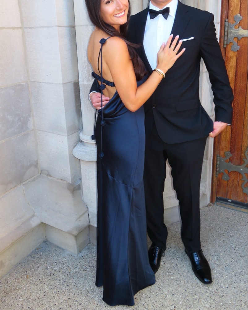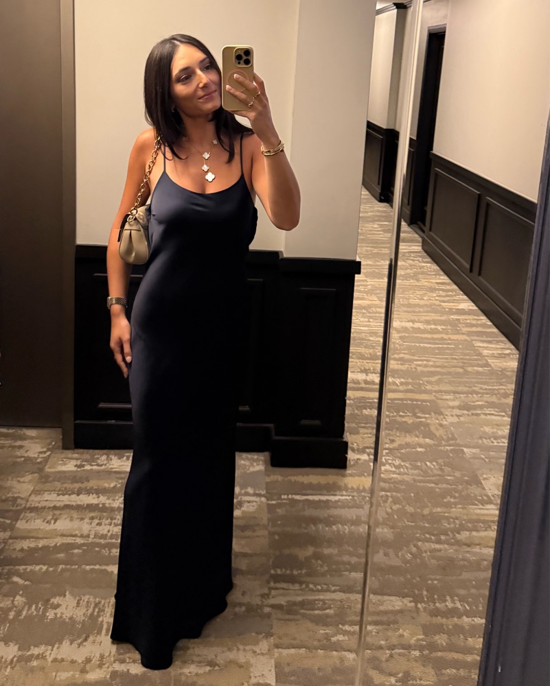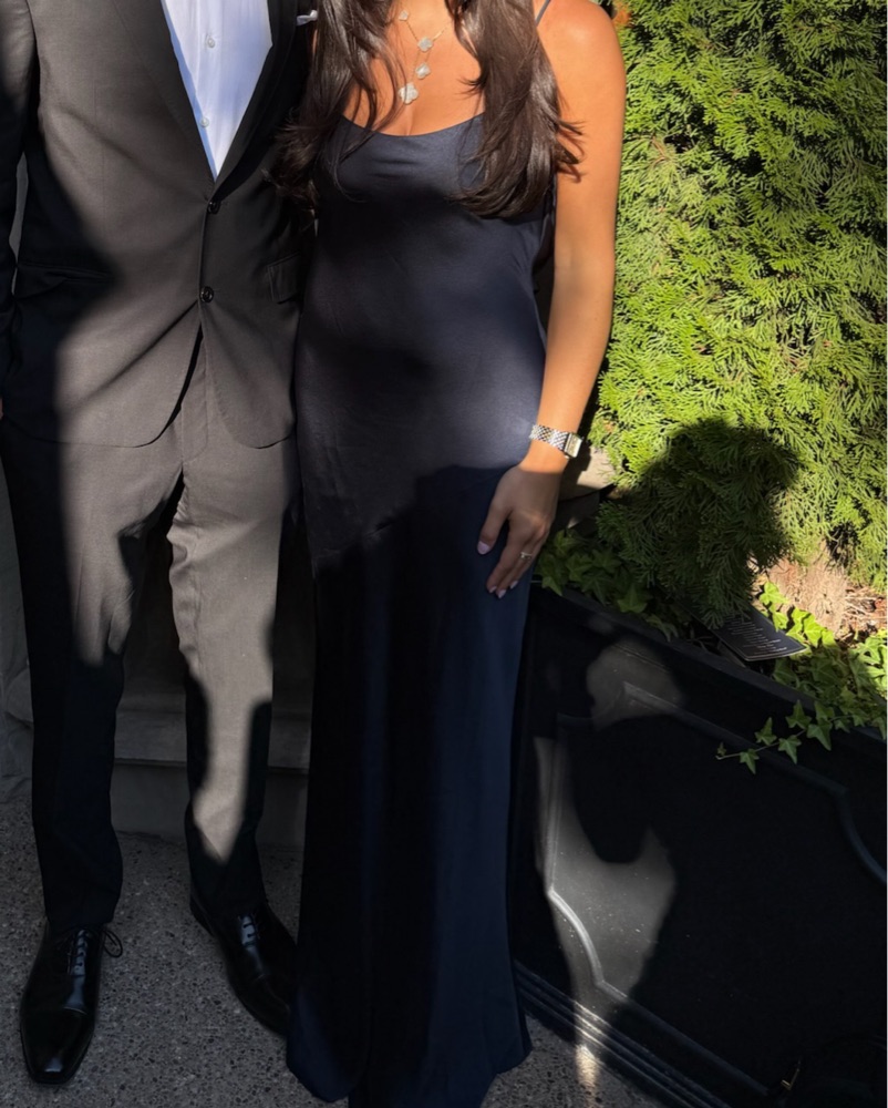Hansel Cowl Neck Sleeveless Gown in Navy from Ramy Brook. Perfect for a black tie wedding guest dress. I am 5’4” size 26, small in tops, 32D for reference. Wearing 6 inch heels in this picture.