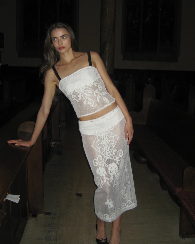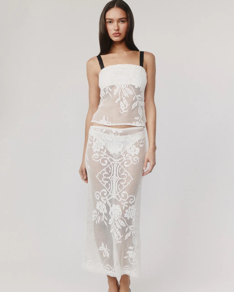 This chic lace ensemble is perfect for a night out. The floral lace design adds a touch of elegance, while the crop top and midi skirt create a flattering silhouette.