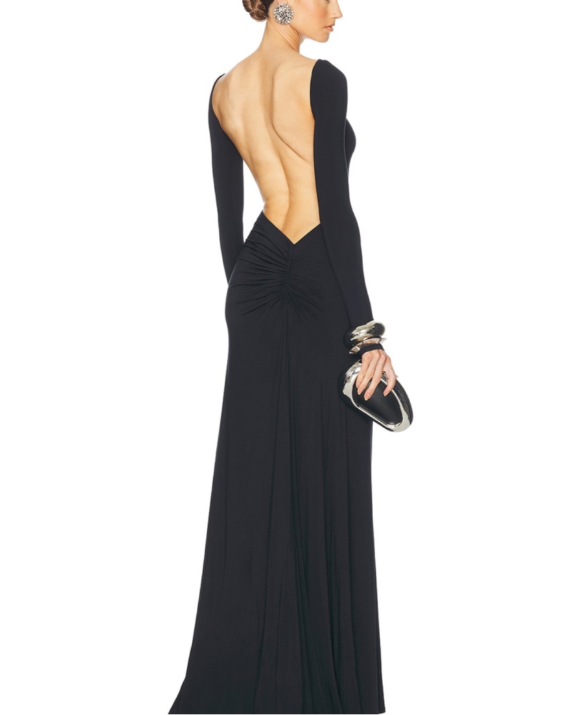 Sophisticated and glamorous, this long black evening gown is perfect for special occasions like galas, formal weddings, or red carpet events.