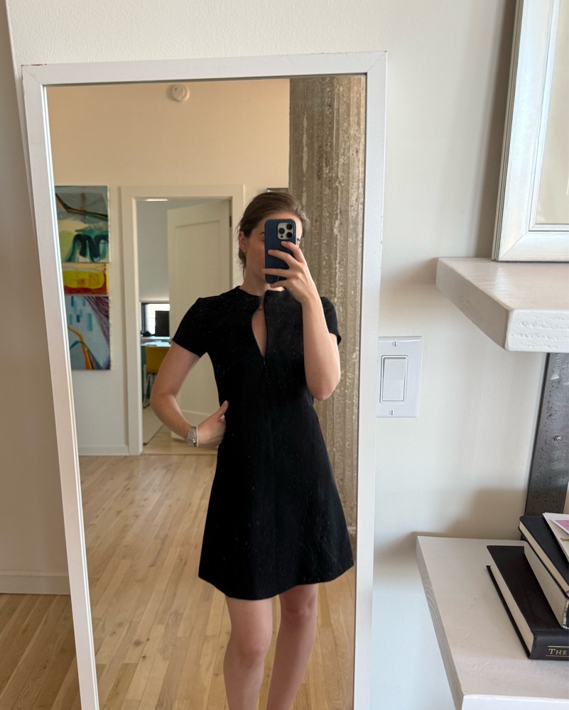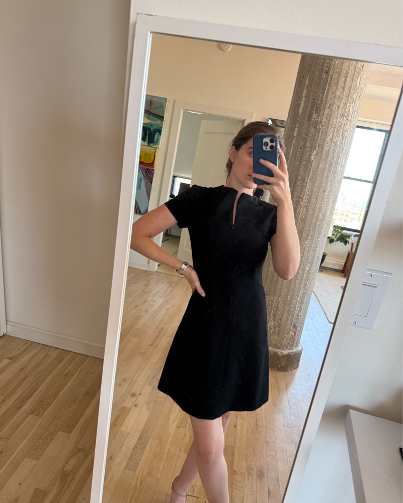 Theory dress with front zipper that allows you to adjust v depth to your liking.