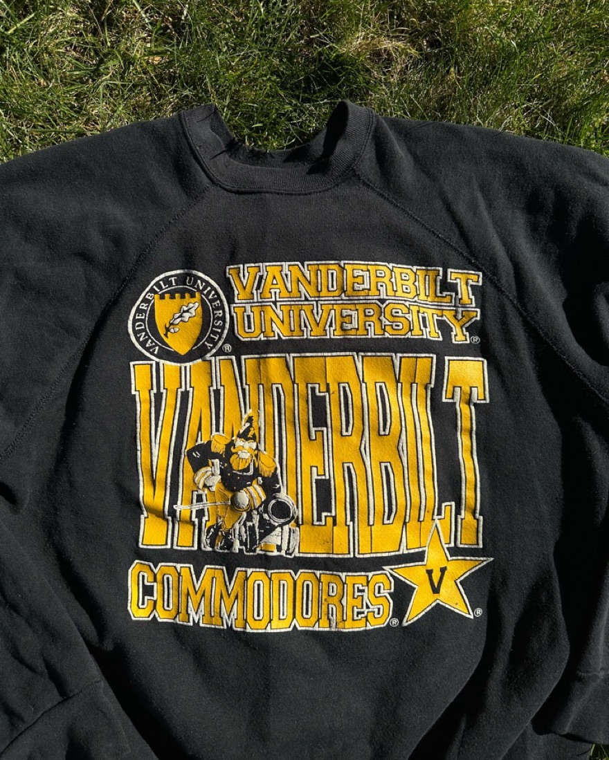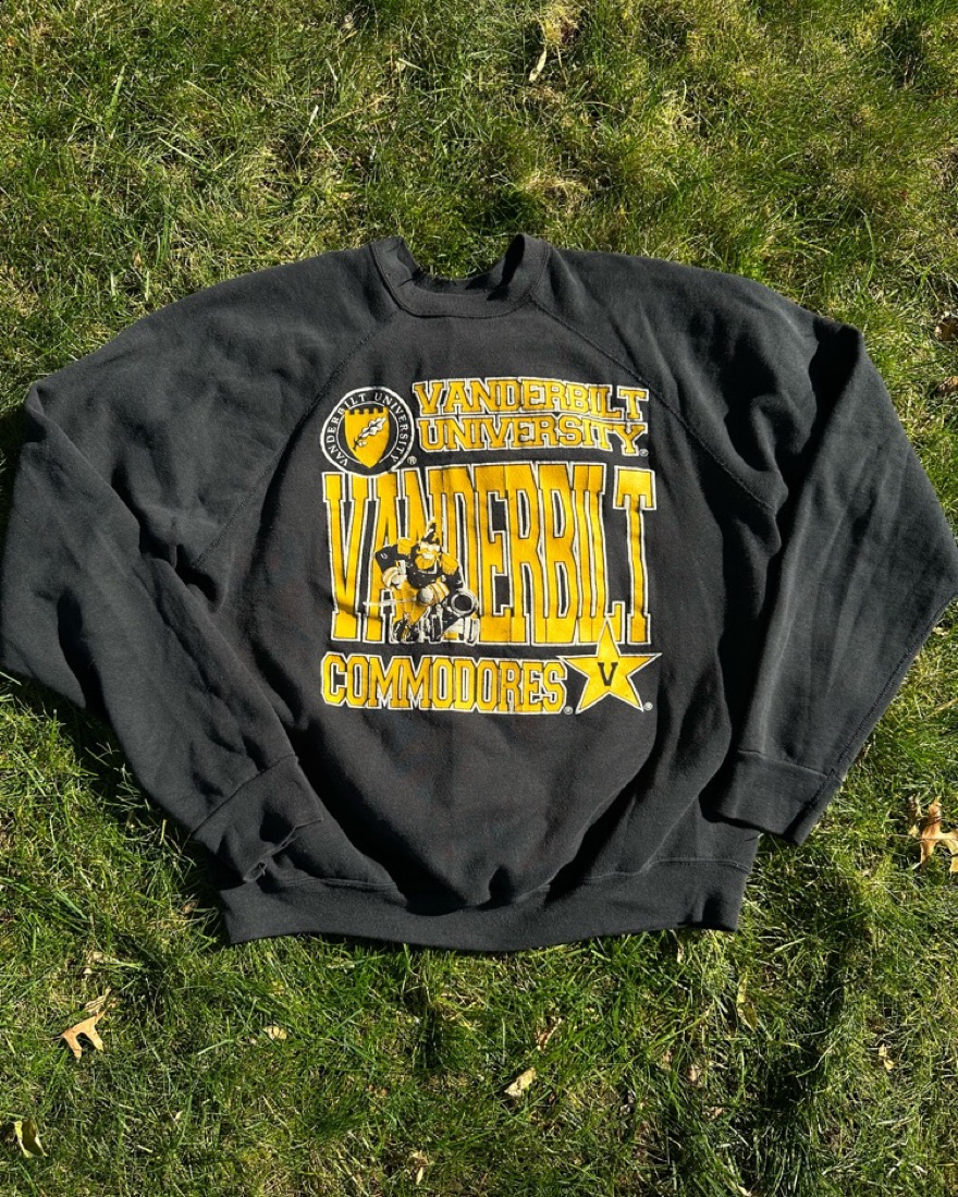 Vanderbilt University (VU) Commodores black crewneck with gold detailing, sourced by Tailgate Teens on Instagram. Whether you’re getting ready for an upcoming tailgate or looking to elevate your street style with a sick vintage piece, this is the perfect piece for you . Go Dores!!!