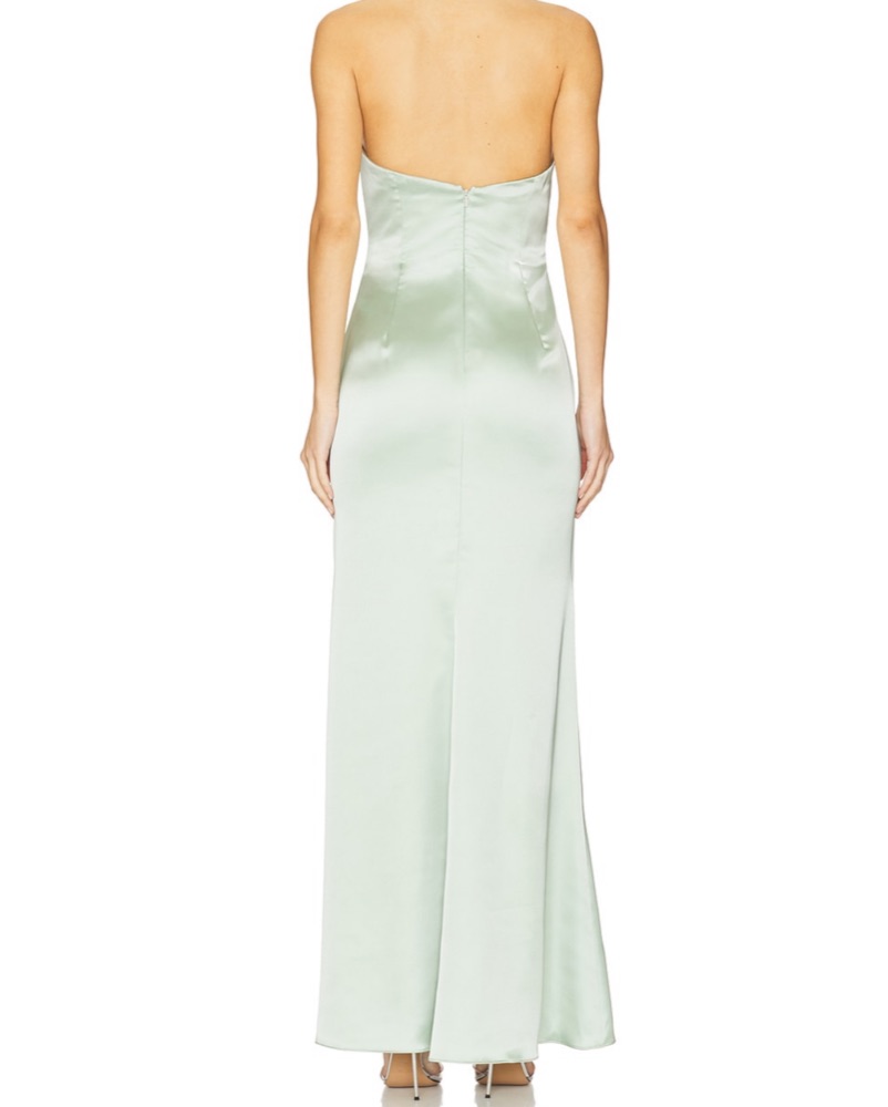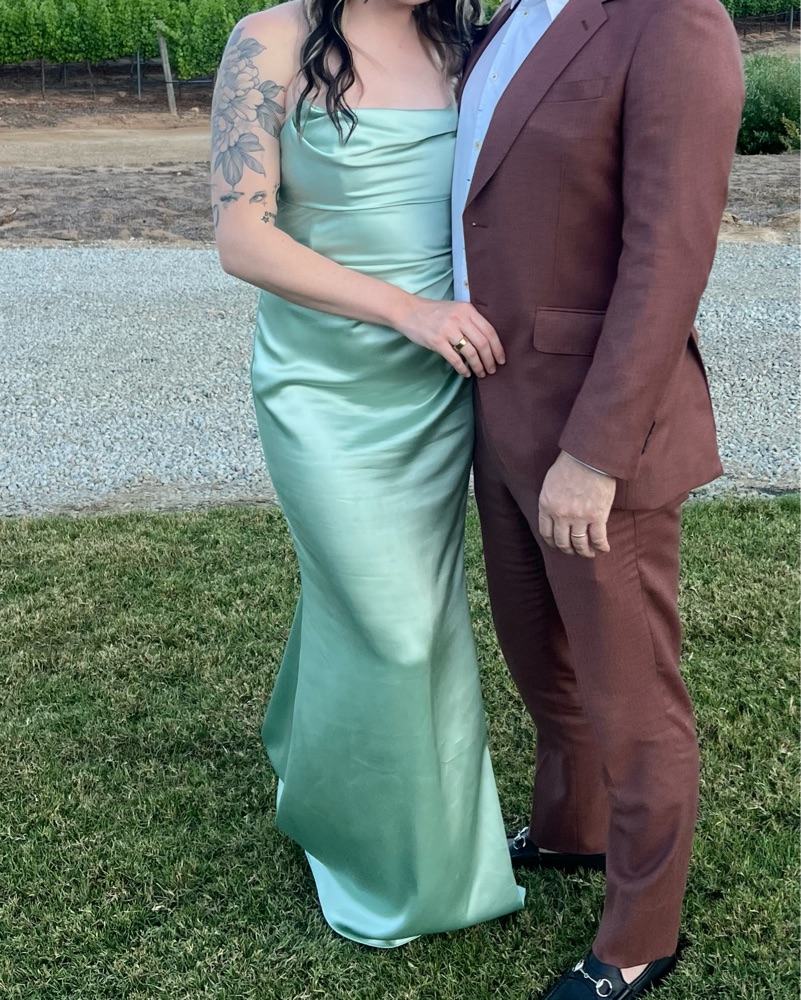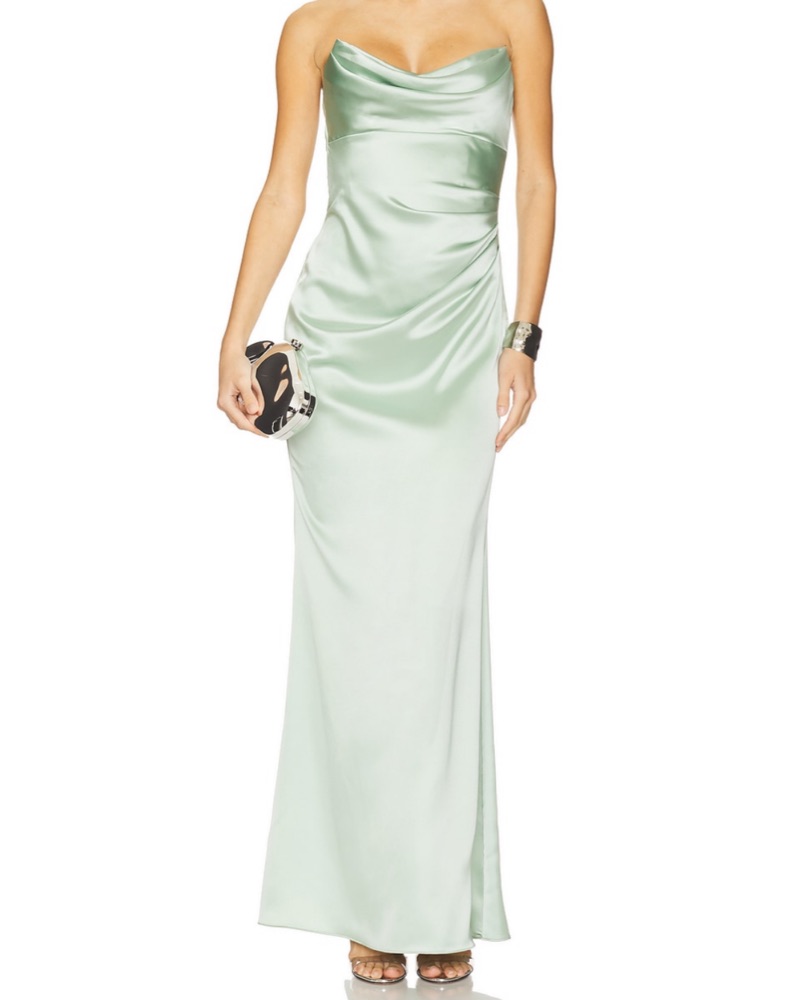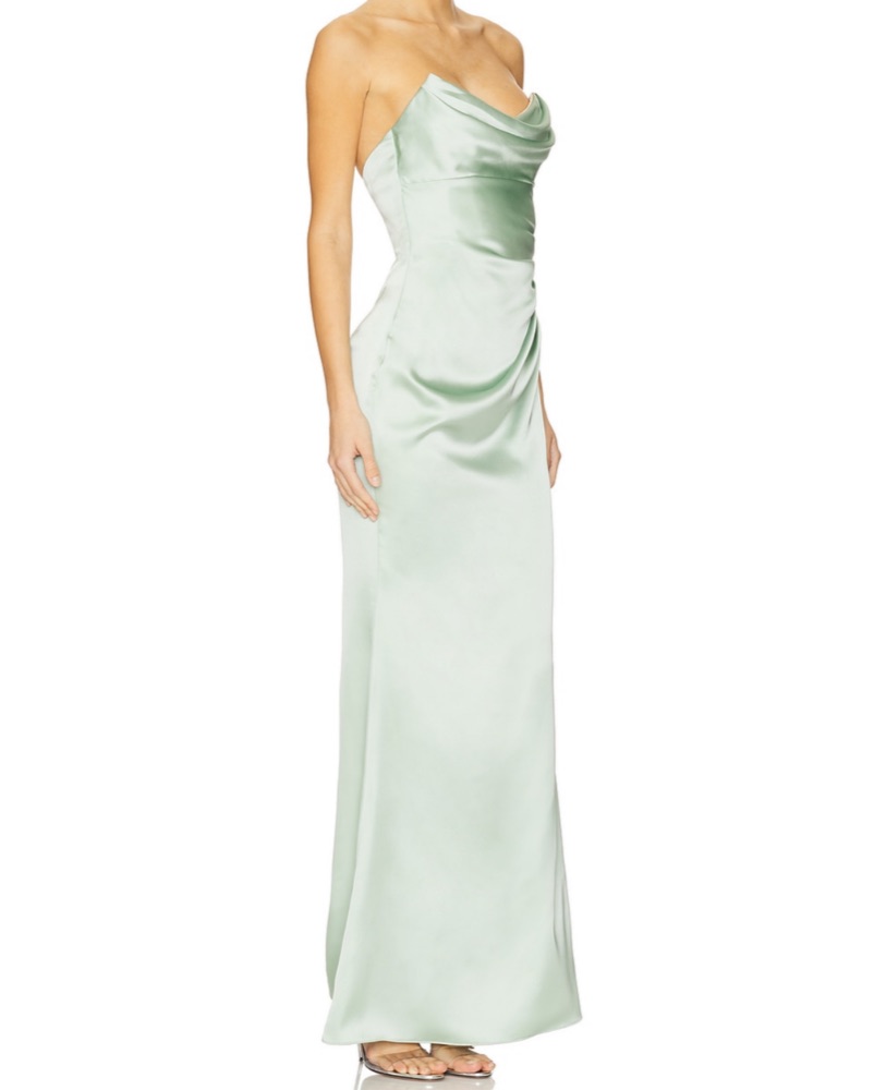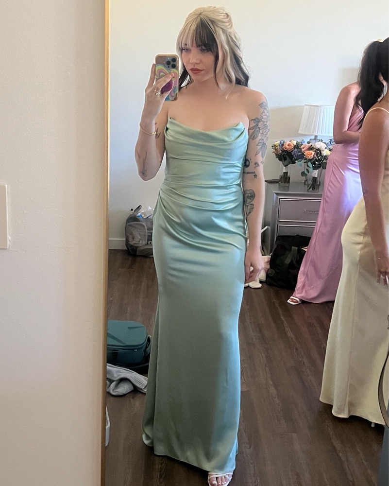 Make your entrance unforgettable in this seafoam satin gown featuring a drapey cowl neckline above side shirring.