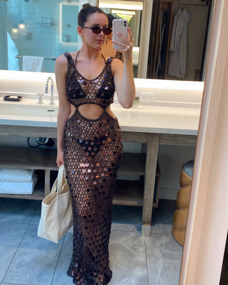 This eye-catching maxi dress features a captivating sequin pattern and alluring cutouts, perfect for a glamorous evening event or special occasion. Love this for a beach club !
