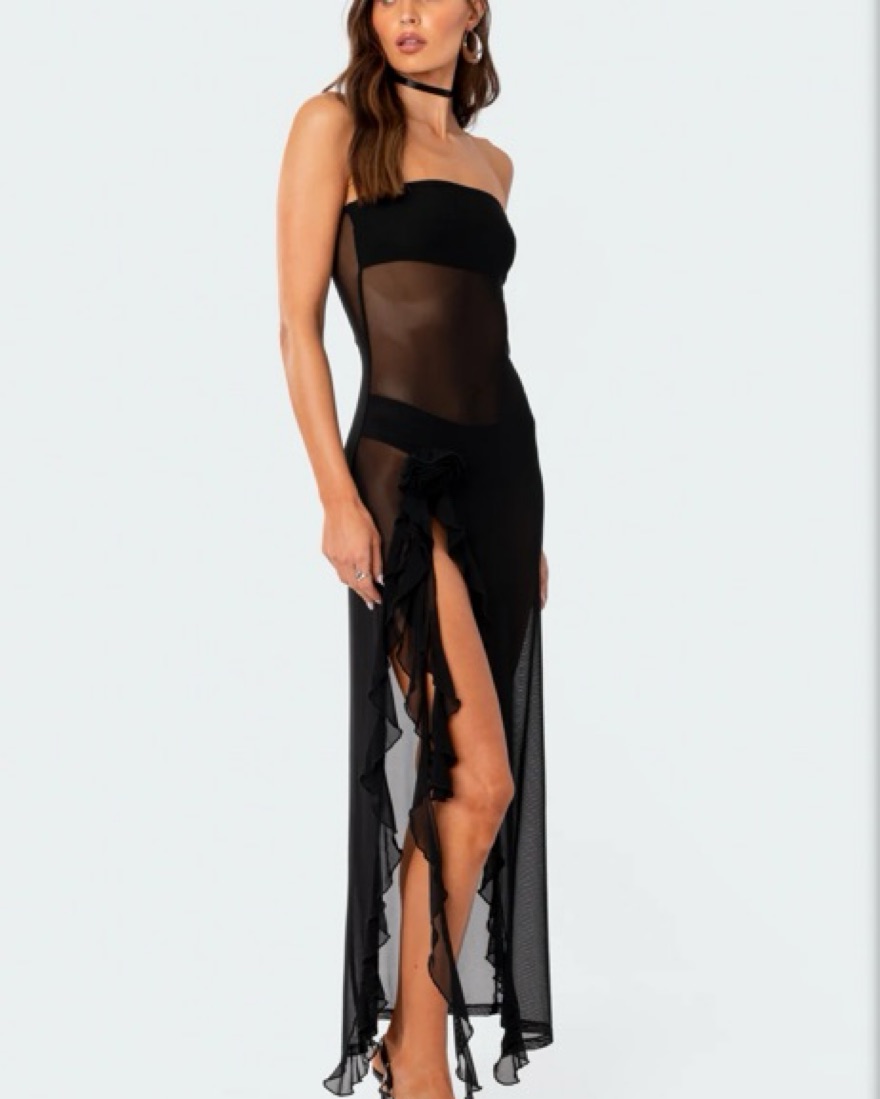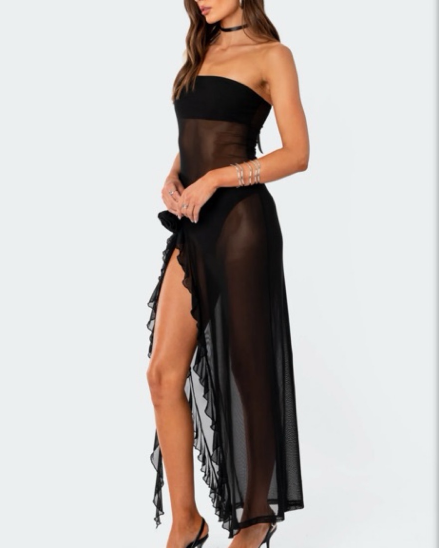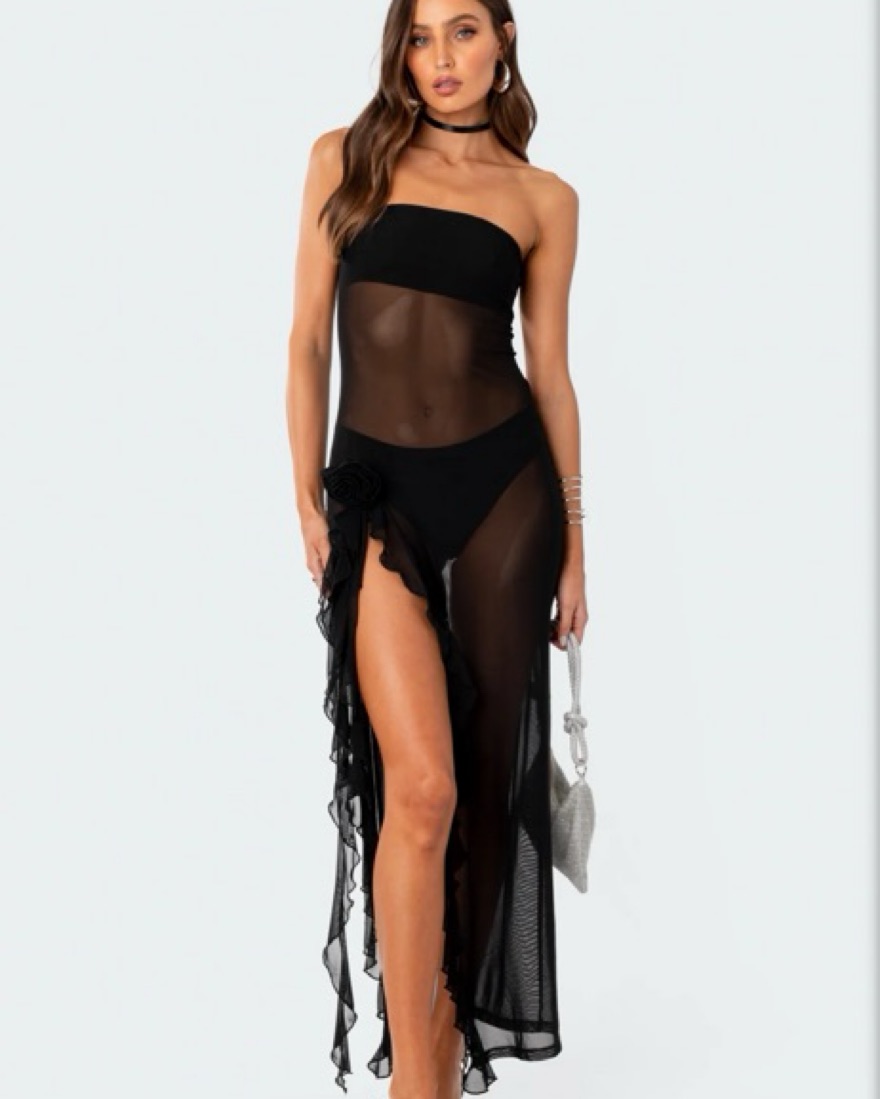 Edikted Sheer Mesh Flower Pin Maxi Dress