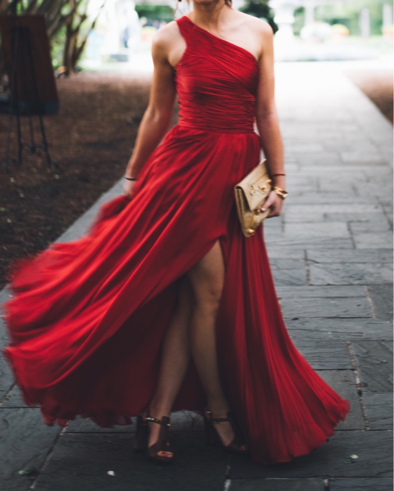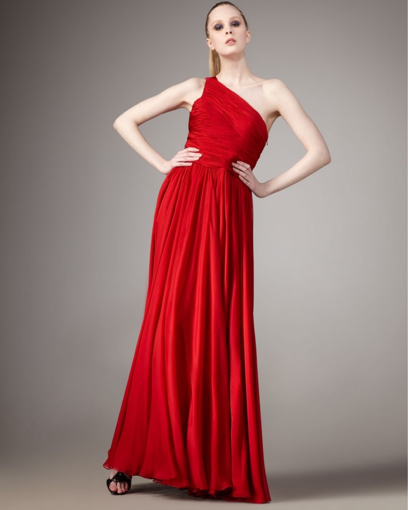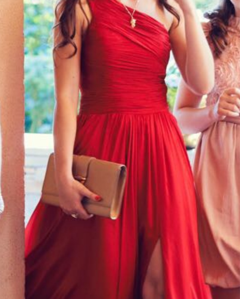 This stunning one-shoulder gown in a vibrant red hue is perfect for a formal event or special occasion. The draped, ruched bodice and flowing skirt create a sophisticated and elegant look.