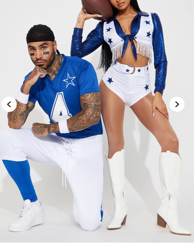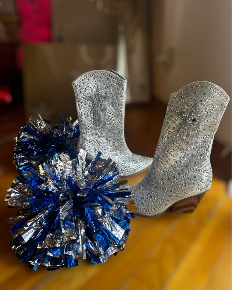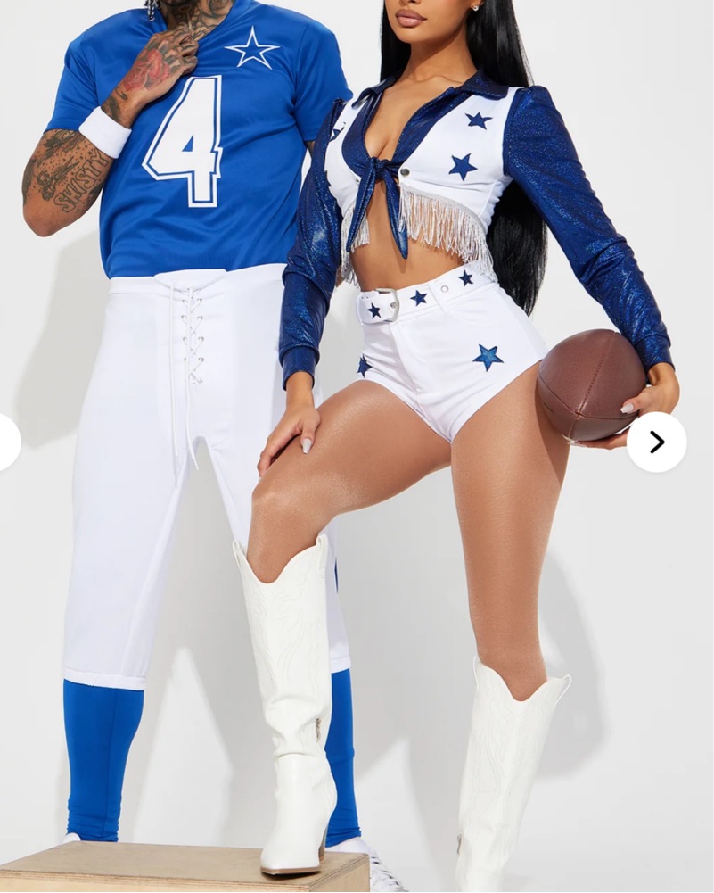 Complete Dallas Cowboys Cheerleader Halloween Costume with Size XS Top, Vest, Shorts, Belt, 2 blue and white PomPoms and Blingy Silver Cowboy Star Boots (very comfy heel! Women’s size 8-8.5) belt detaches so u can switch the bottoms!!