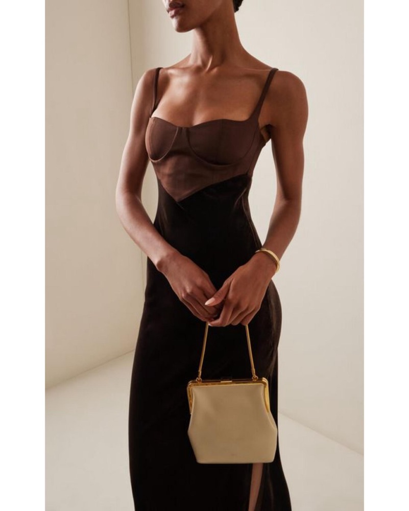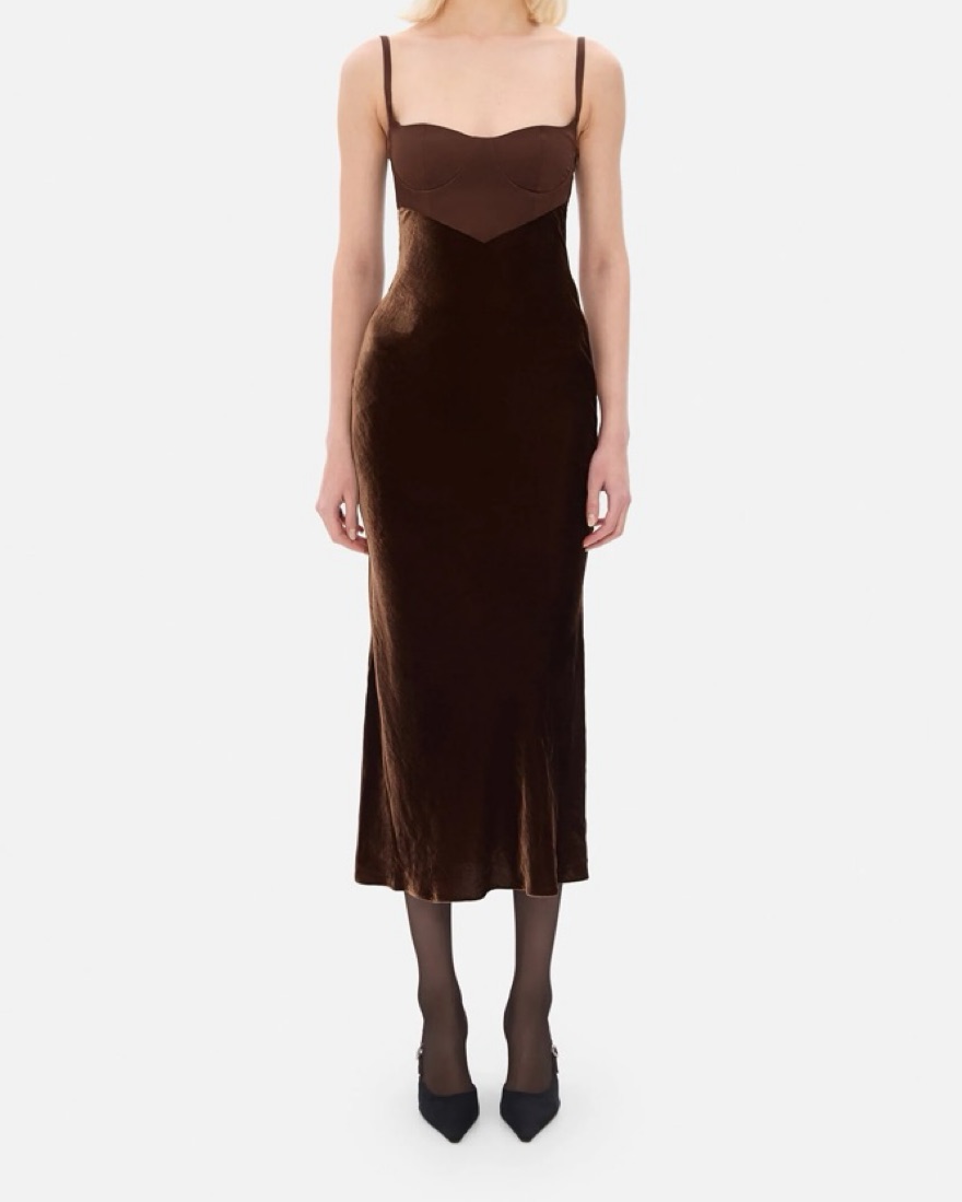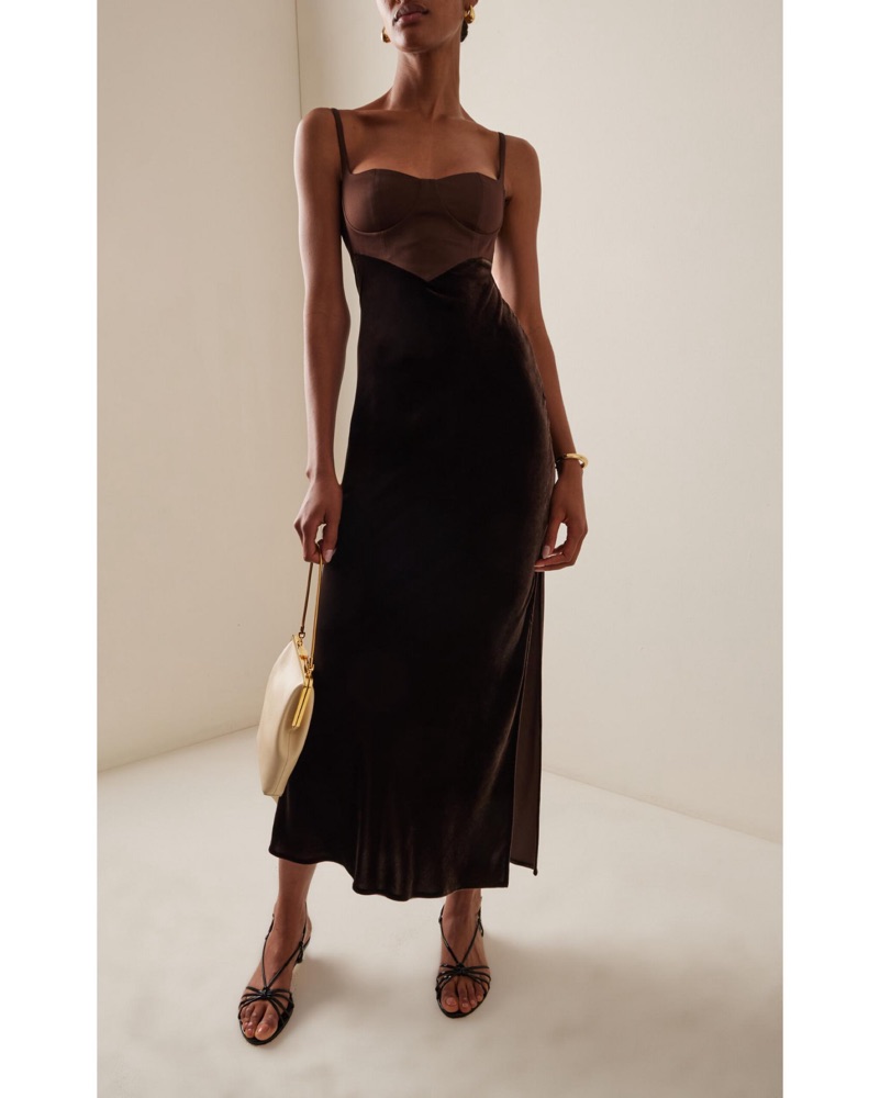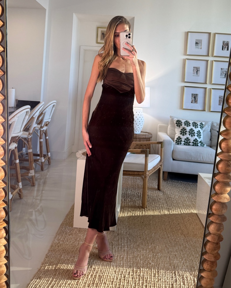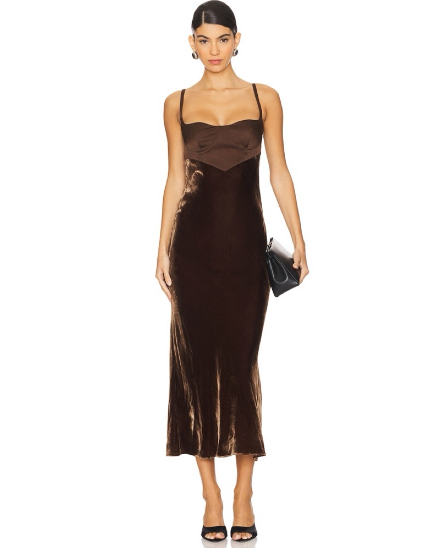 Size small. Model is 5'10" and wearing S. Please handle with care. Tags: brown dress, brown midi dress, brown formal dress, velvet dress, holiday dress, cult gaia, cocktail, Christmas party, holiday party