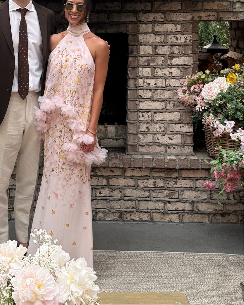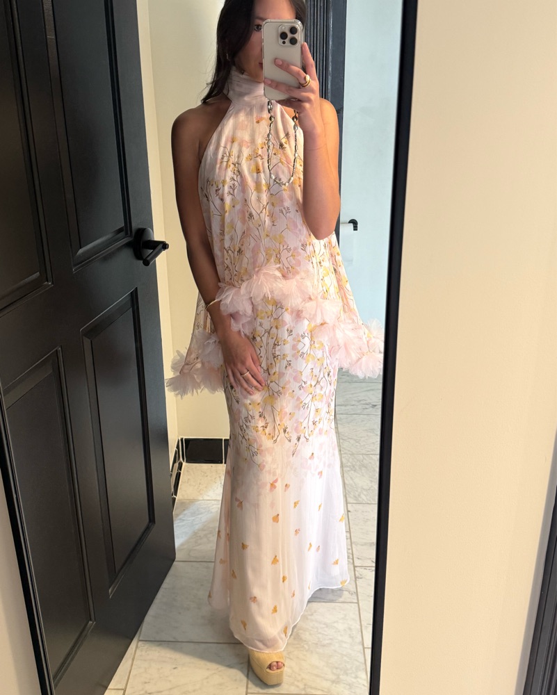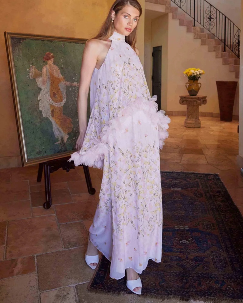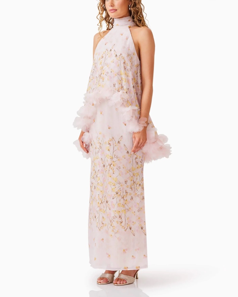 Elliatt Tulsia Capelet Maxi Dress. Light pink/multi colored. Size XXS. 1960s glam is alive and bright in this sleeveless maxi dress designed with a fluttery, ruffled capelet and finished with lovely floral embroidery.