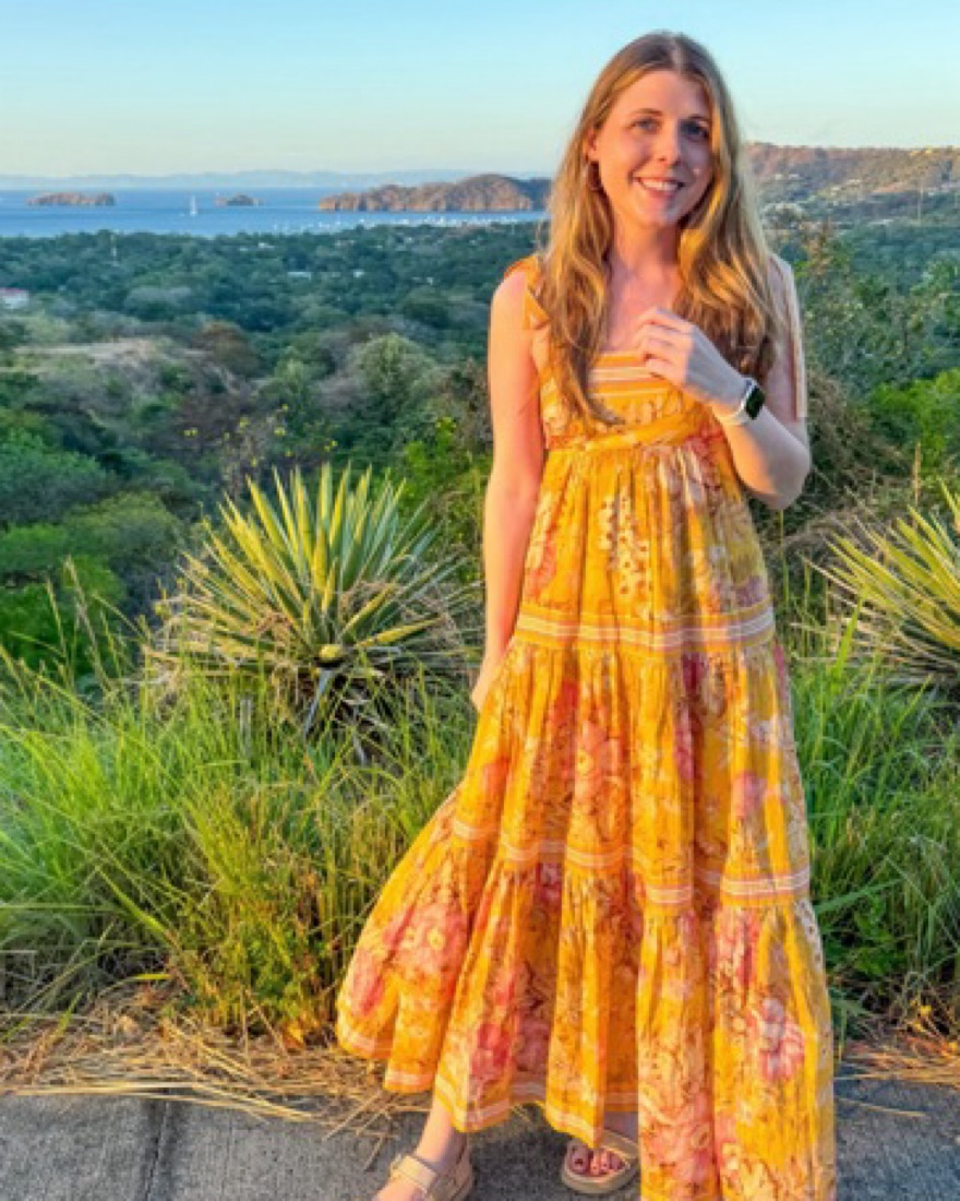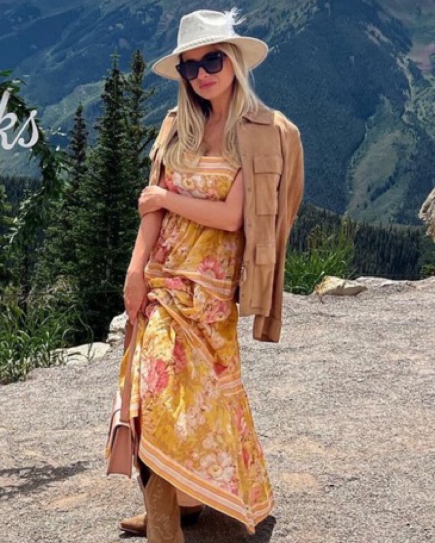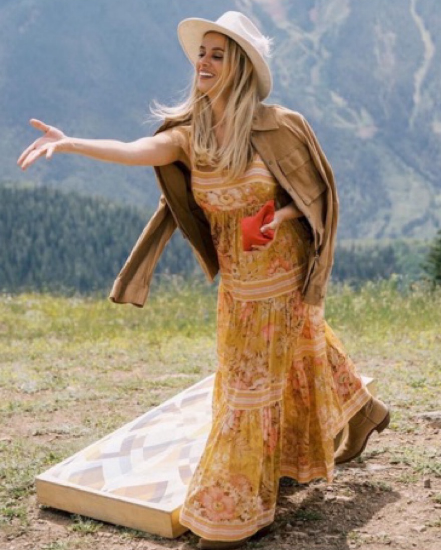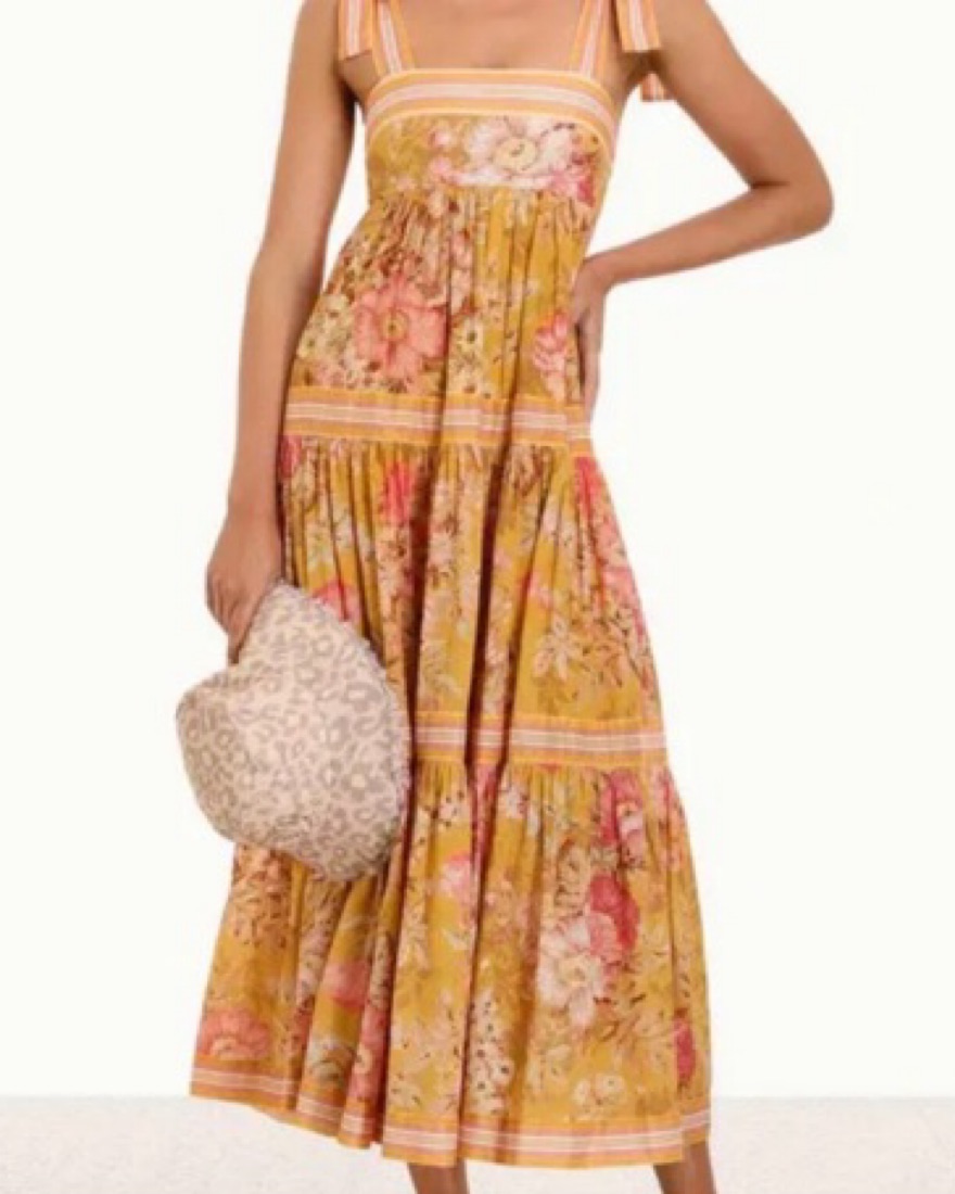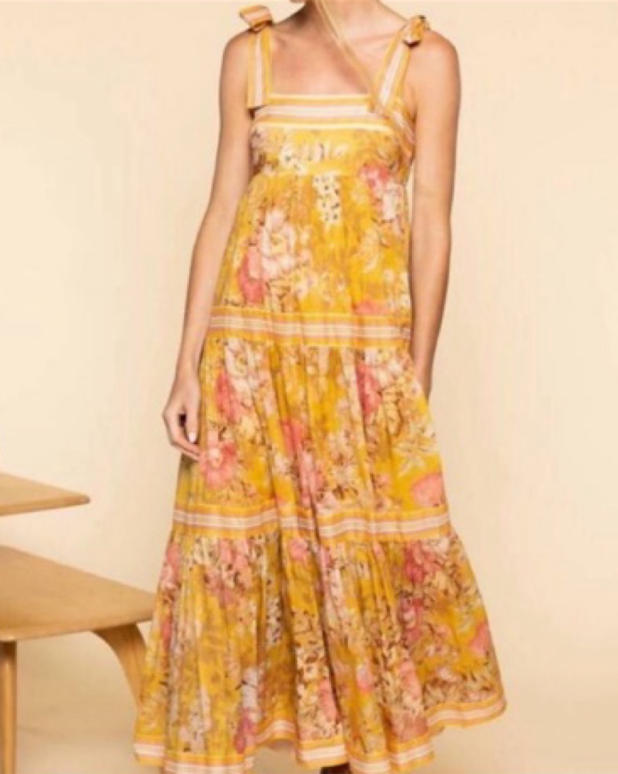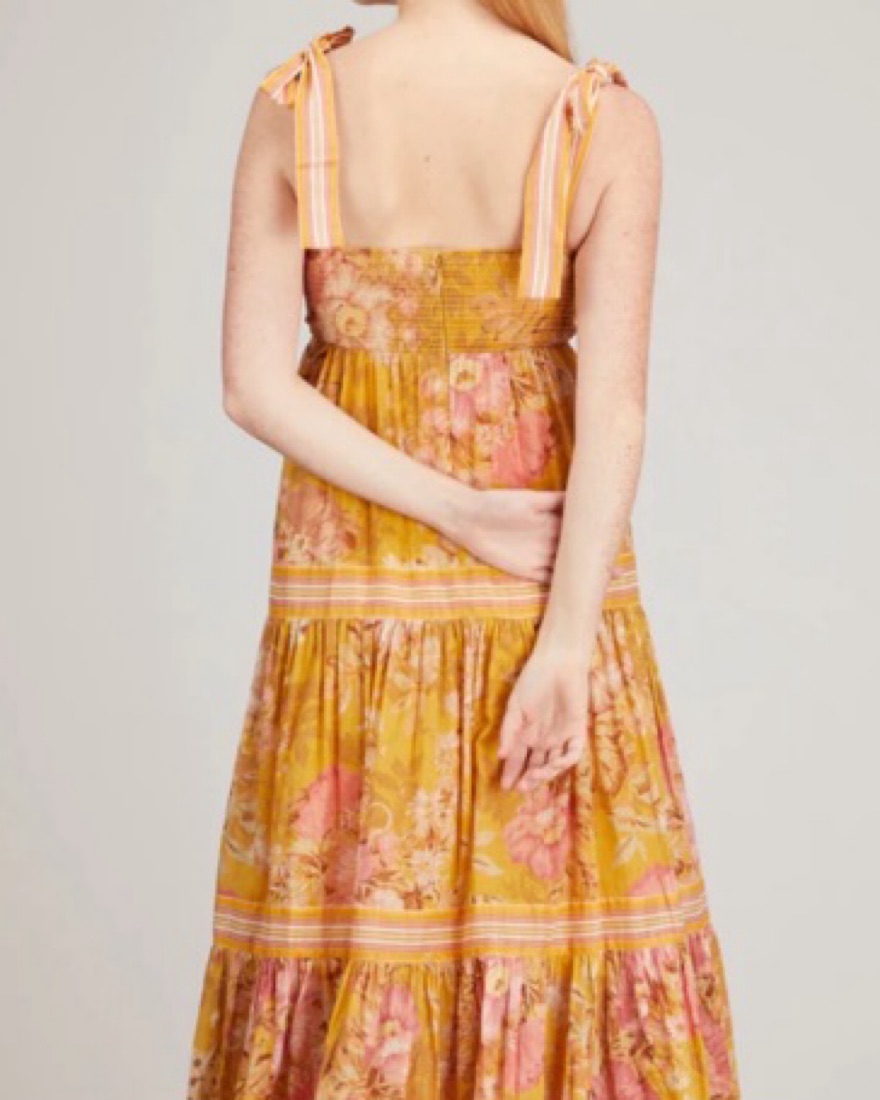 The Pattie Tie Shoulder Dress in mustard floral from Zimmermann's SS22 collection was made with a warm, sunny day in mind. It offers a soft glam look with its empire waist and self tie shoulder straps. This vintage-inspired dress features a tiered skirt adorned with stripes and floral patterns.