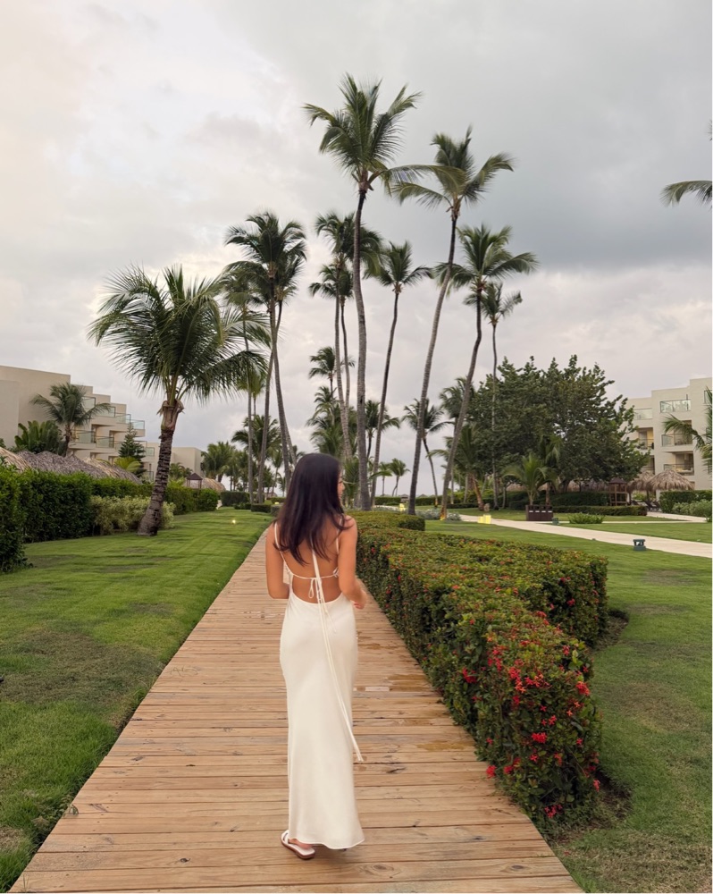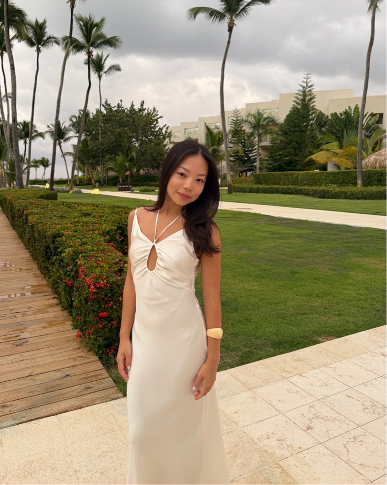 White silk maxi dress perfect for summer! I’m 5’2” and the length is perfect on me
