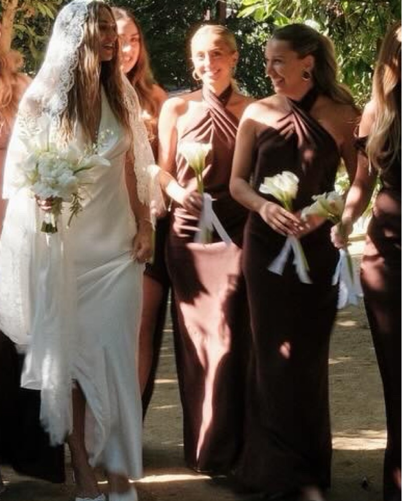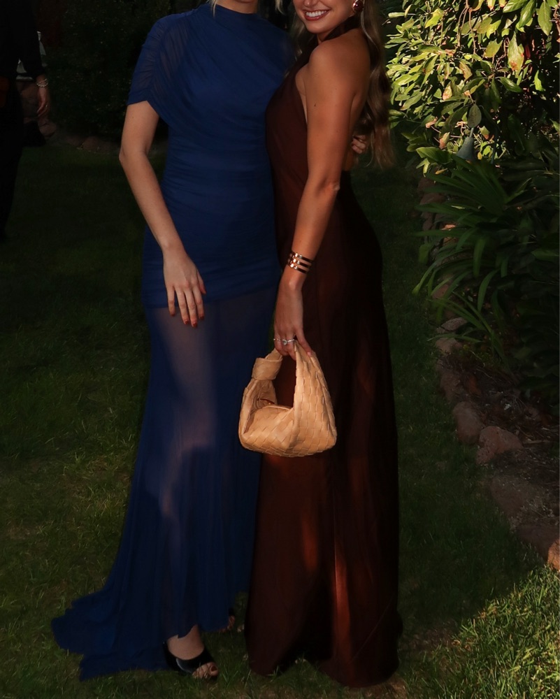 Show Me Your Mumu Jasmine Halter Maxi dress in chocolate brown, size XS, worn once, luxe satin material