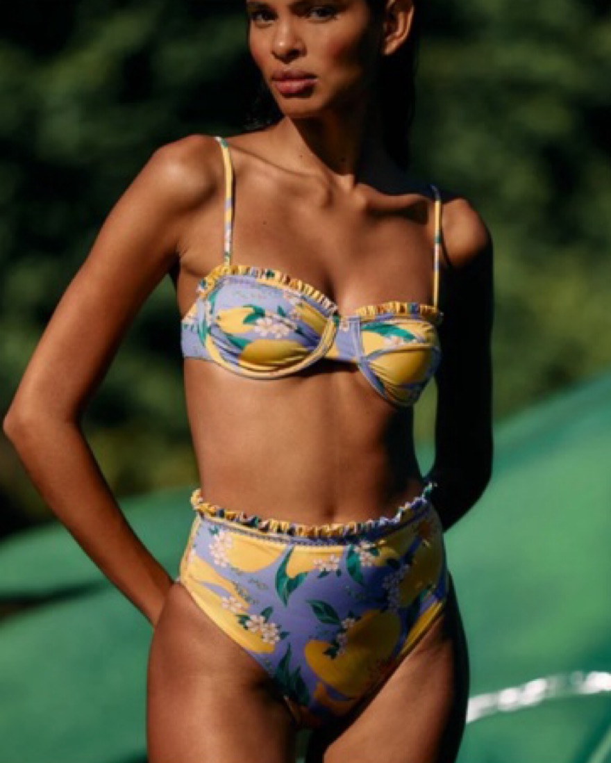 Vibrant yellow and purple floral print bikini top by Farm Rio in a size medium! Also have the matching bottoms in an XS to rent - posted on my closet!