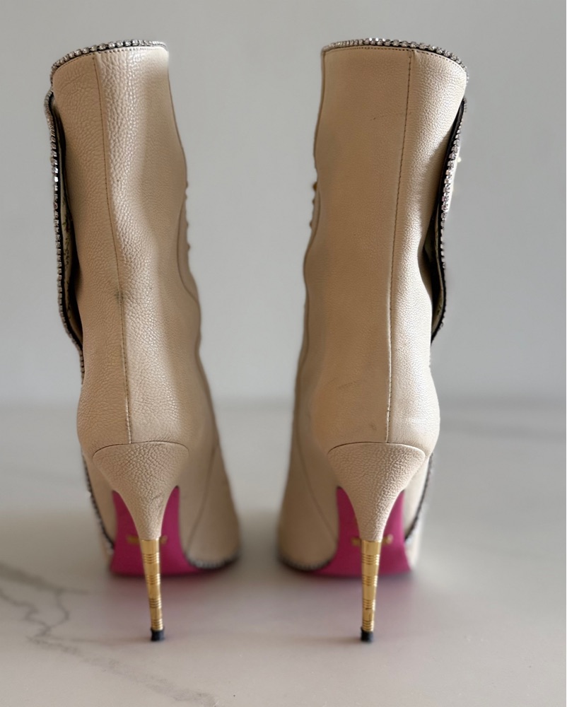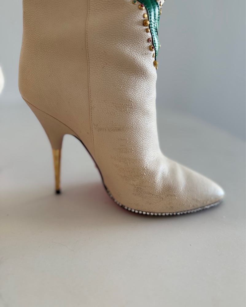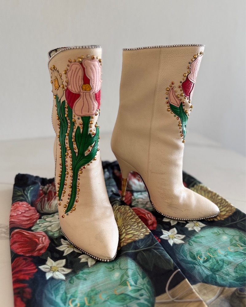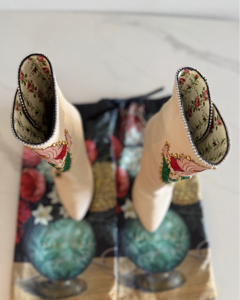 As seen on Hailey Bieber, Beyoncé, Gwen Stefani, etc. Ivory leather heeled western boots with Intarsia floral embroidery, jewel and stud embellishment, and crystal trim.