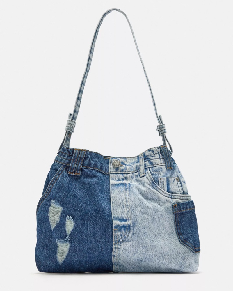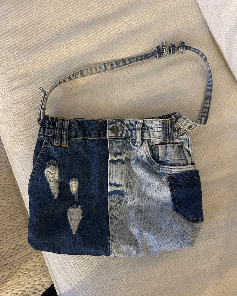 This one-of-a-kind denim shoulder bag brings a touch of edgy style to any outfit. Its unique patchwork design and distressed details make it a versatile accessory for both casual and dressy occasions.