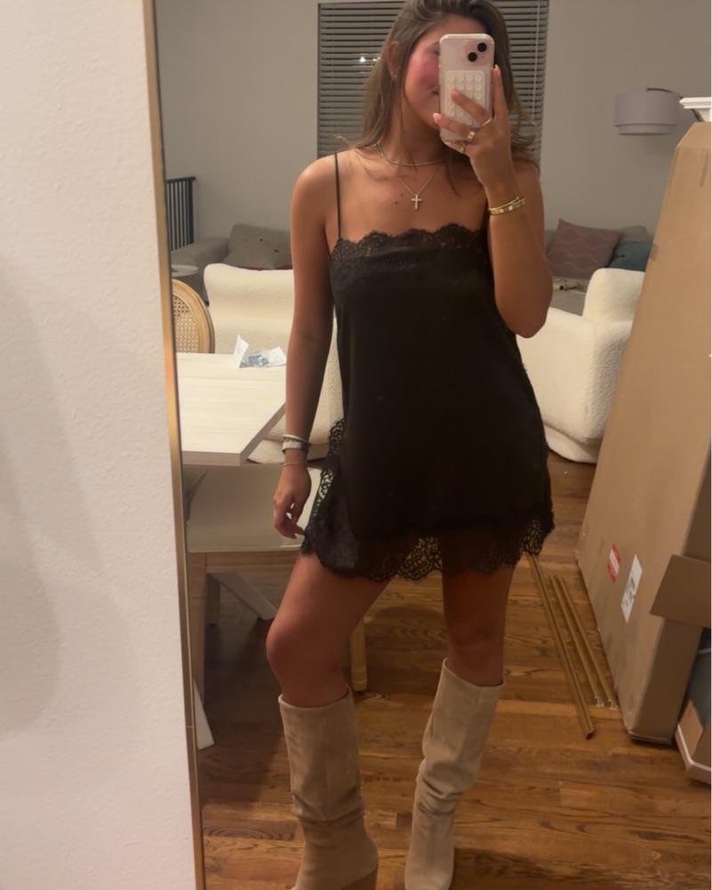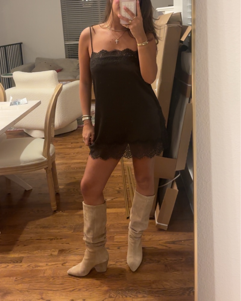 Elevate your style with this chic brown mini dress. The delicate lace trim adds a touch of feminine flair, making it perfect for a night out or special occasion.