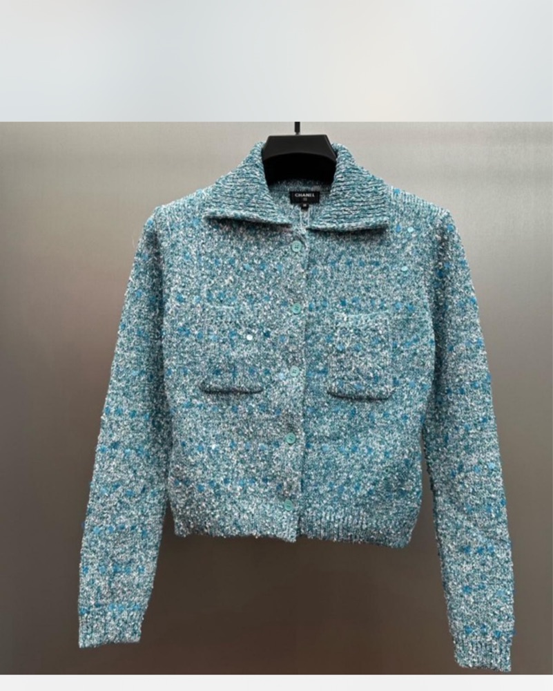 This Chanel tweed jacket is a timeless classic. The textured, speckled pattern adds visual interest and can be dressed up or down for any occasion. Thinking about adding this to my closet ✨