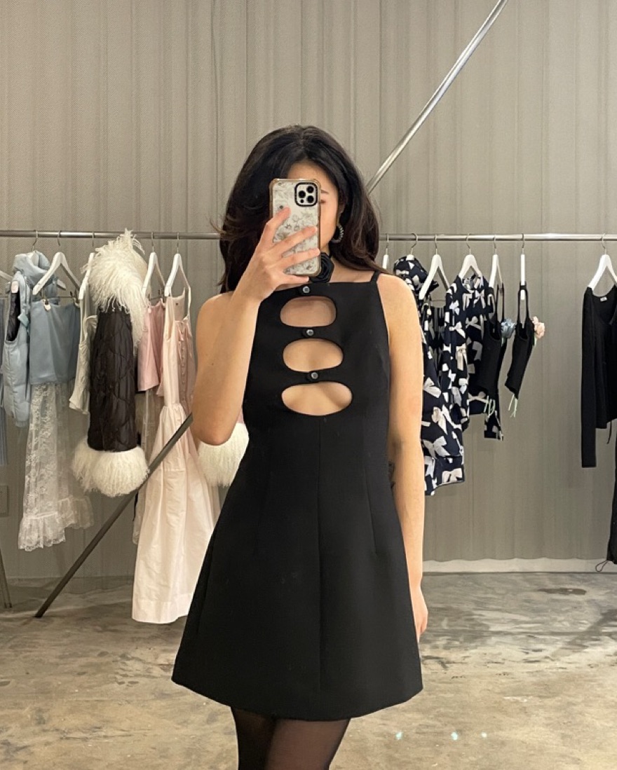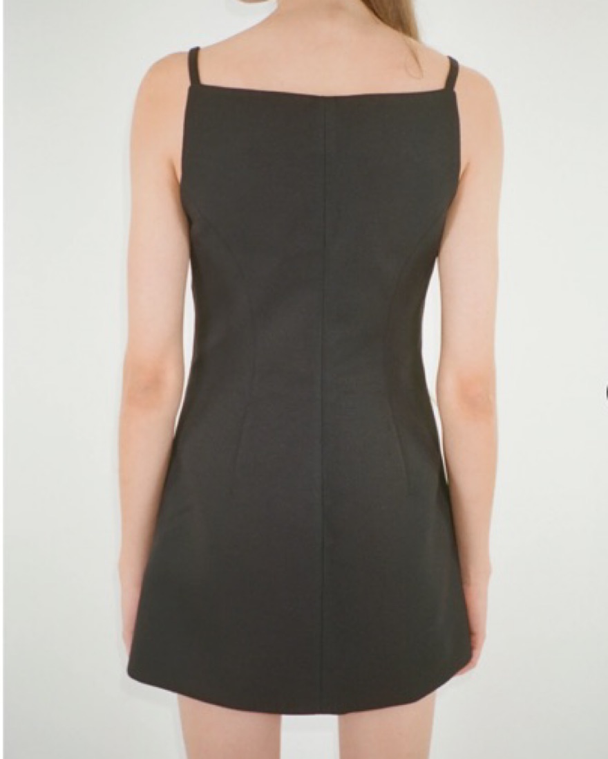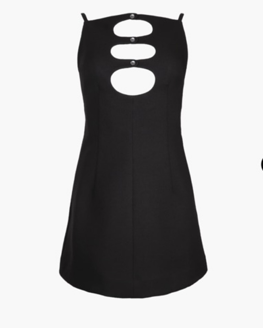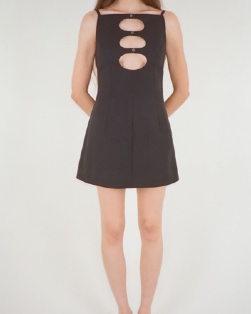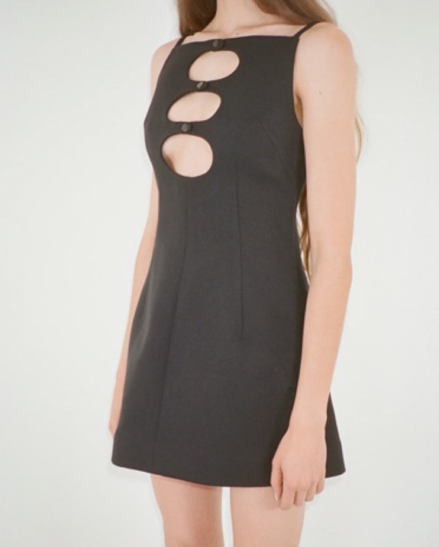 Mini dress in Black suiting fabric, Featuring cutouts at front with mother of pearl buttons