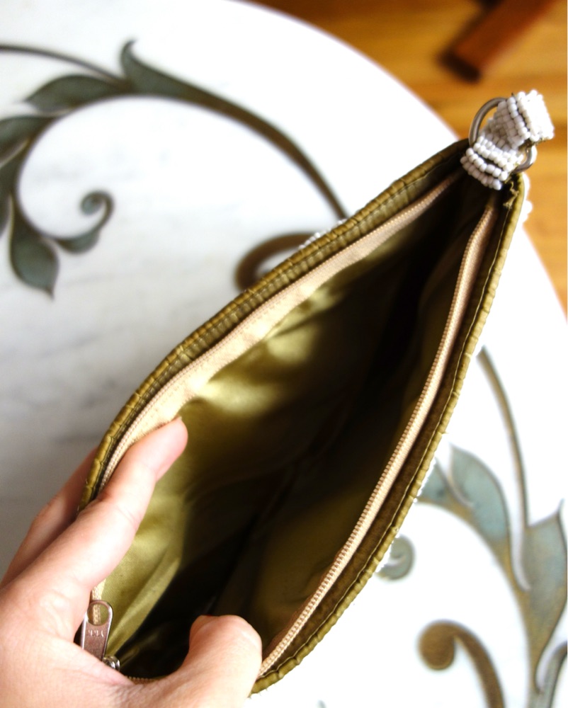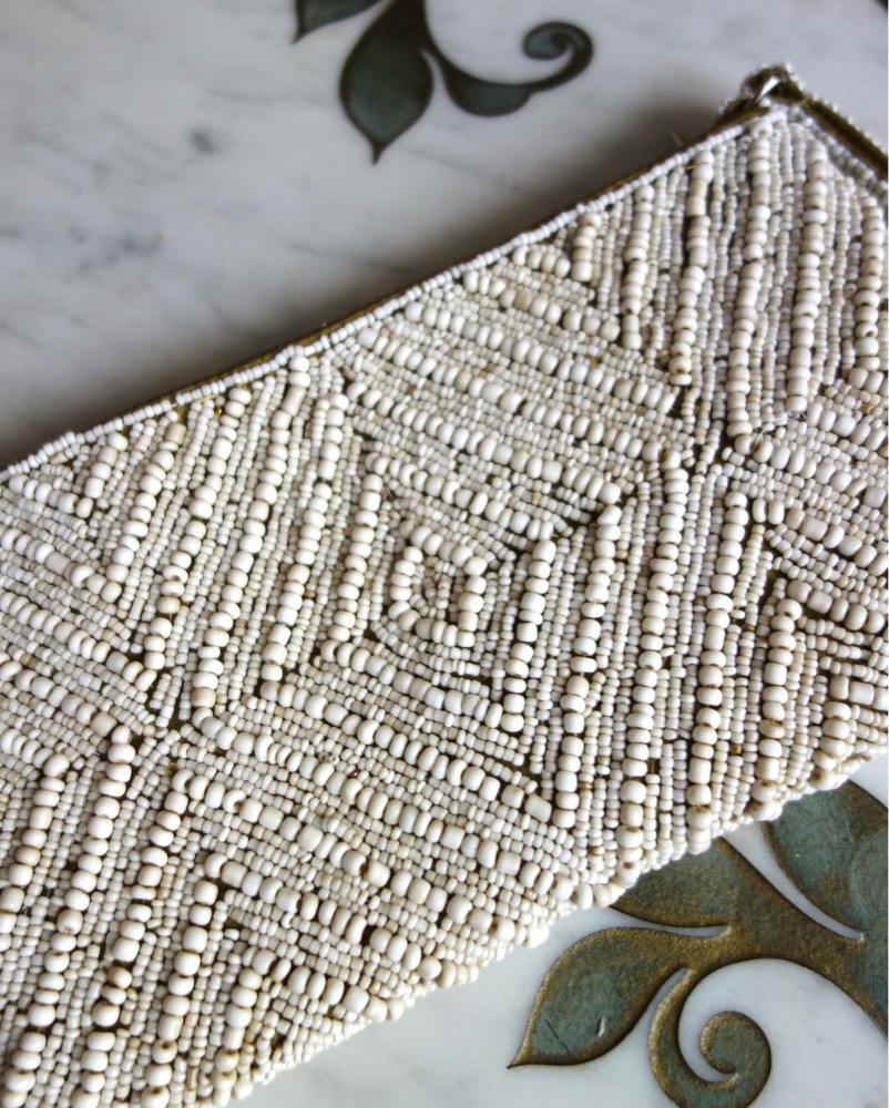 White beaded clutch! Perfect for vacations or any beach trip. Comes with a little wrist strap. Measures 9”x5 ½”
