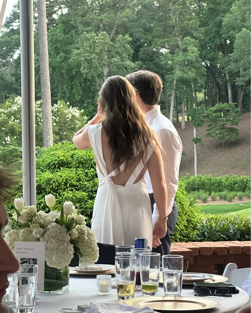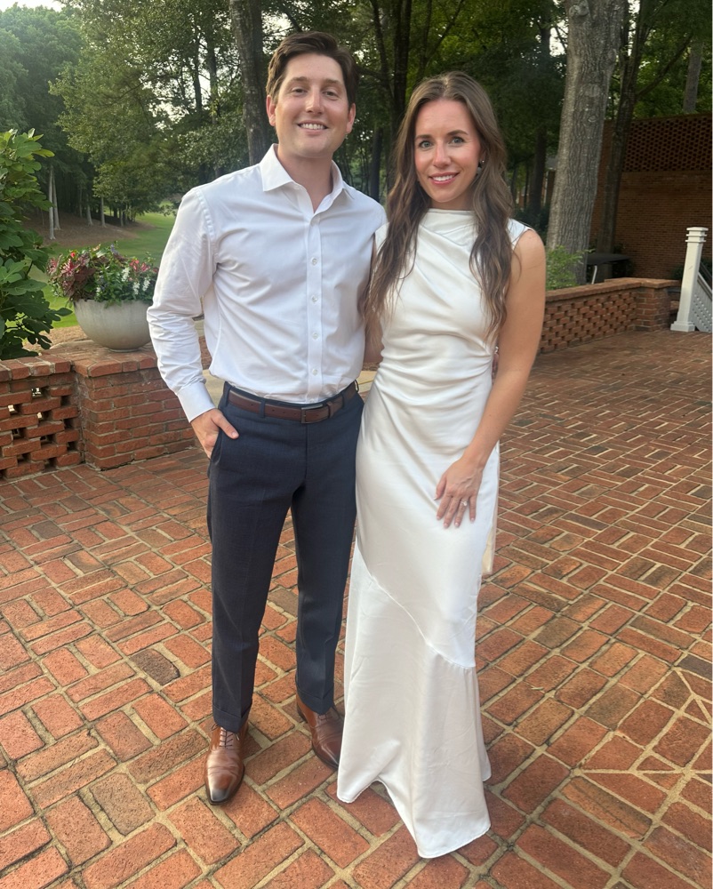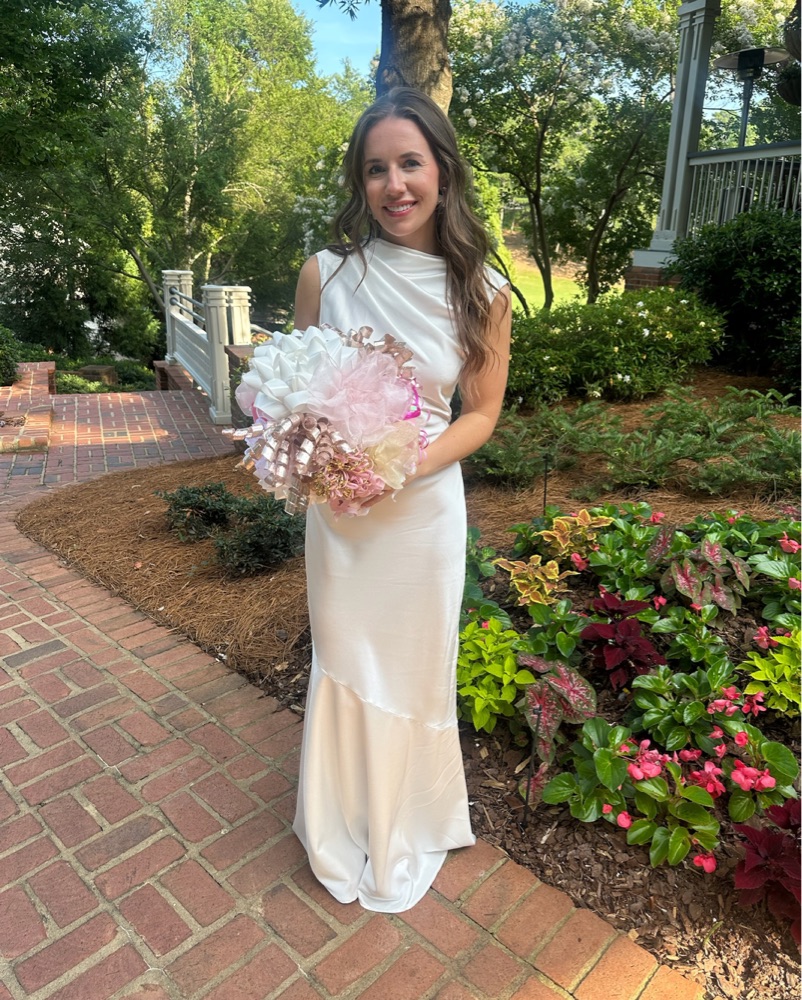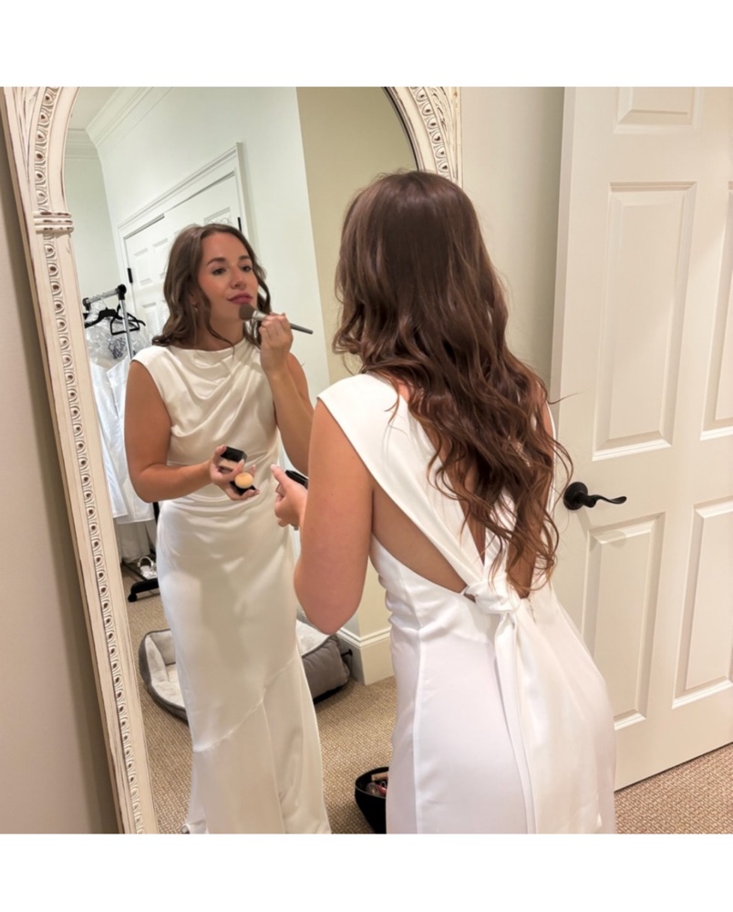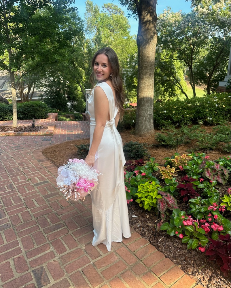 Size 4 and fits true to size. I'm 5'4 and wore 3 inch heels. I tried on so many satin dresses and this was the only one that was not see through! Adjustable strap with knot on the back! Tags : Rehearsal dinner dress, white maxi, full length, bridal, wedding dress