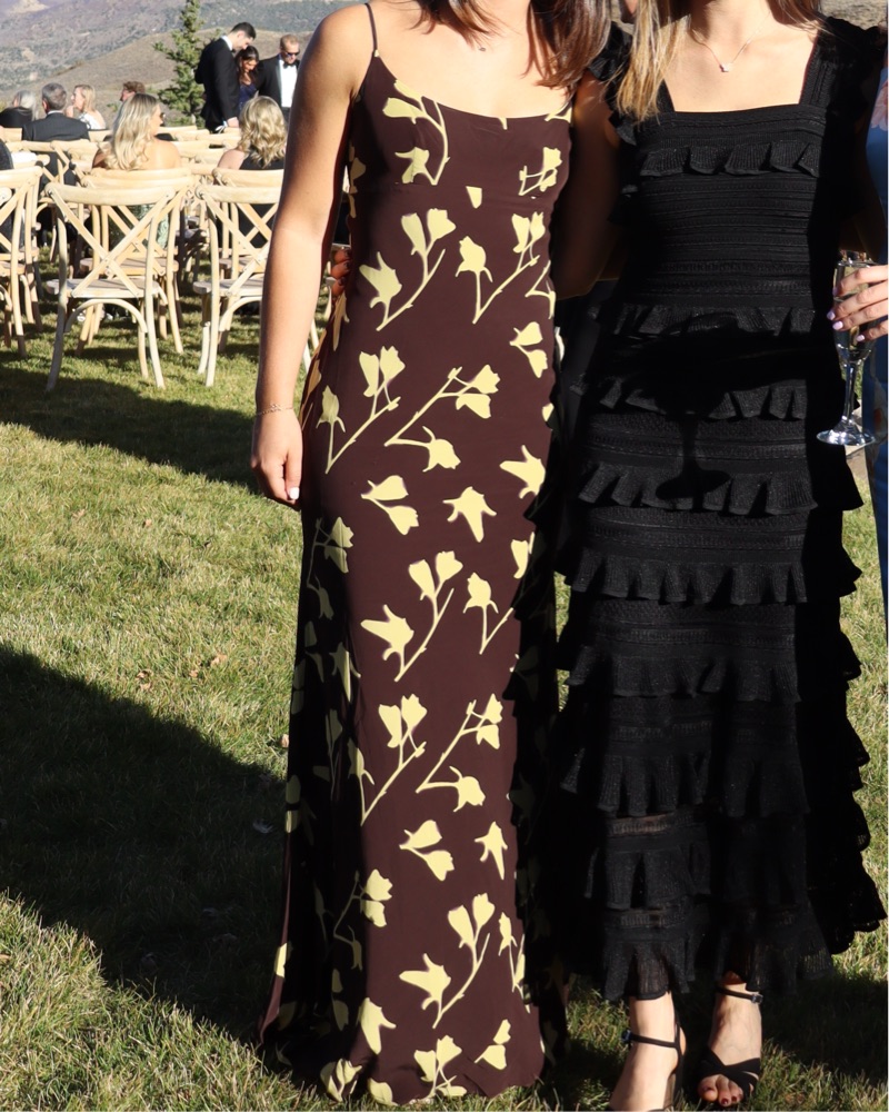 Brown and yellow dress, worn 2x, very good condition. Adjustable straps. 5’3 and worn with heels