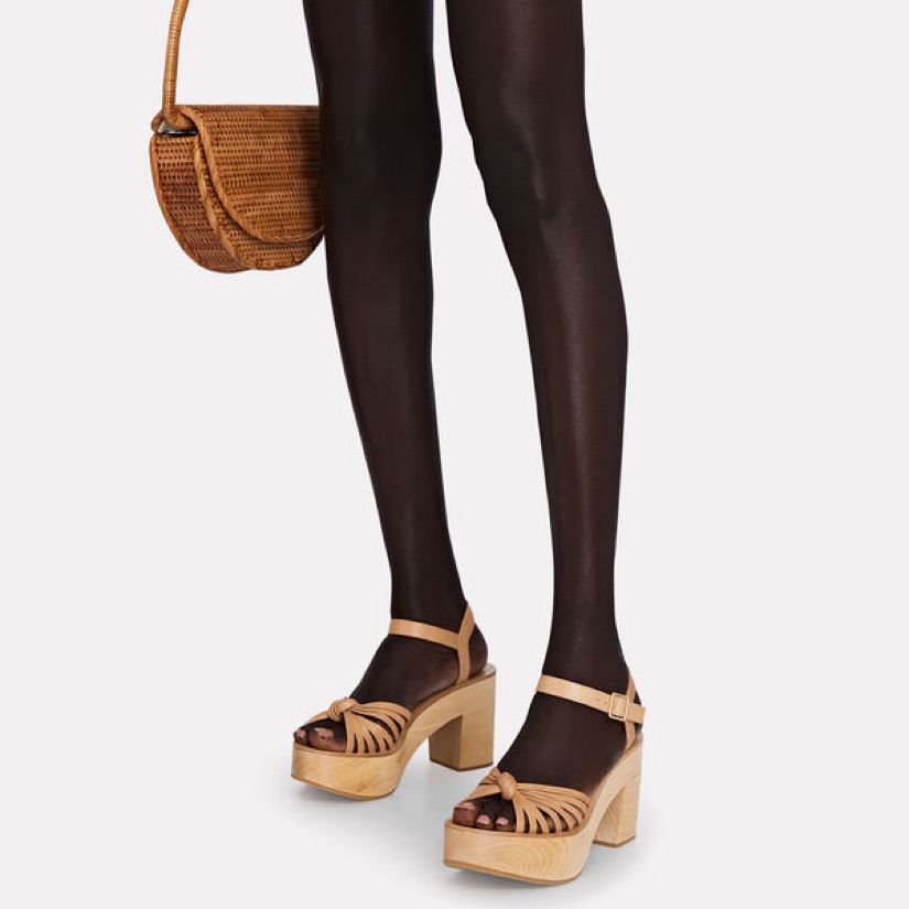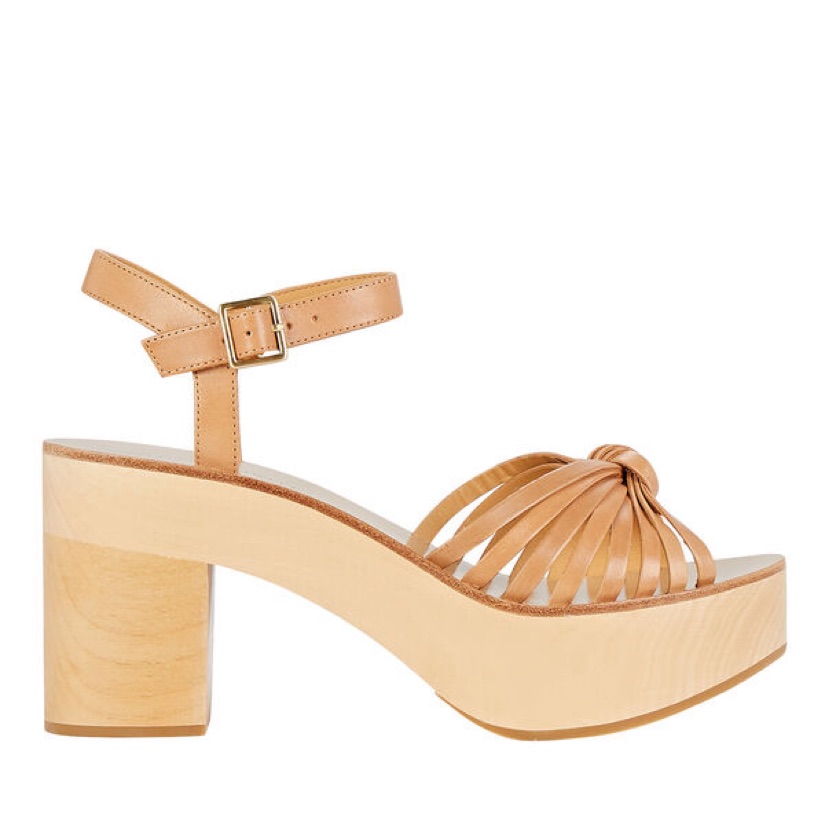 Super comfortable wood platform heel with tan leather straps and knotted detail. 4 inch heel and 2 inch platform.