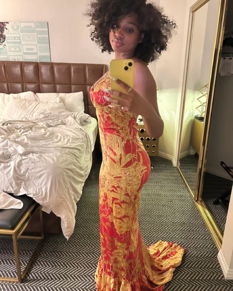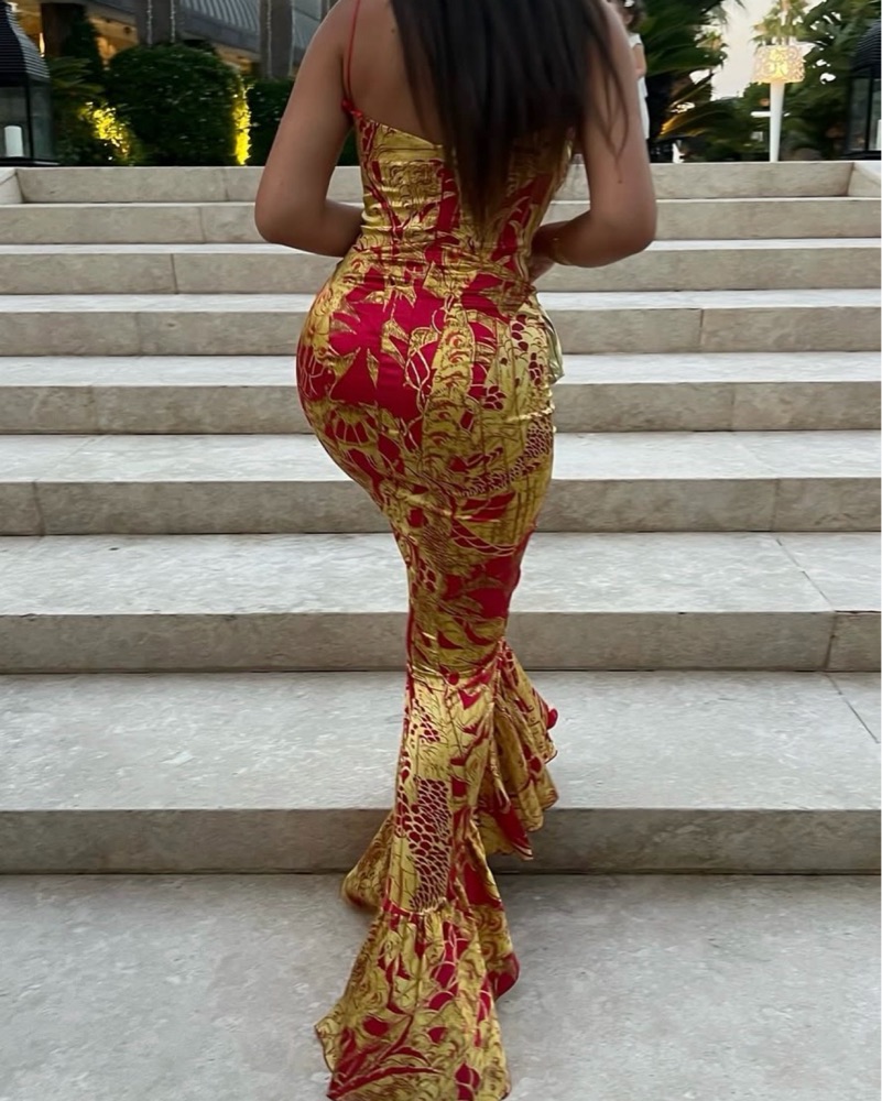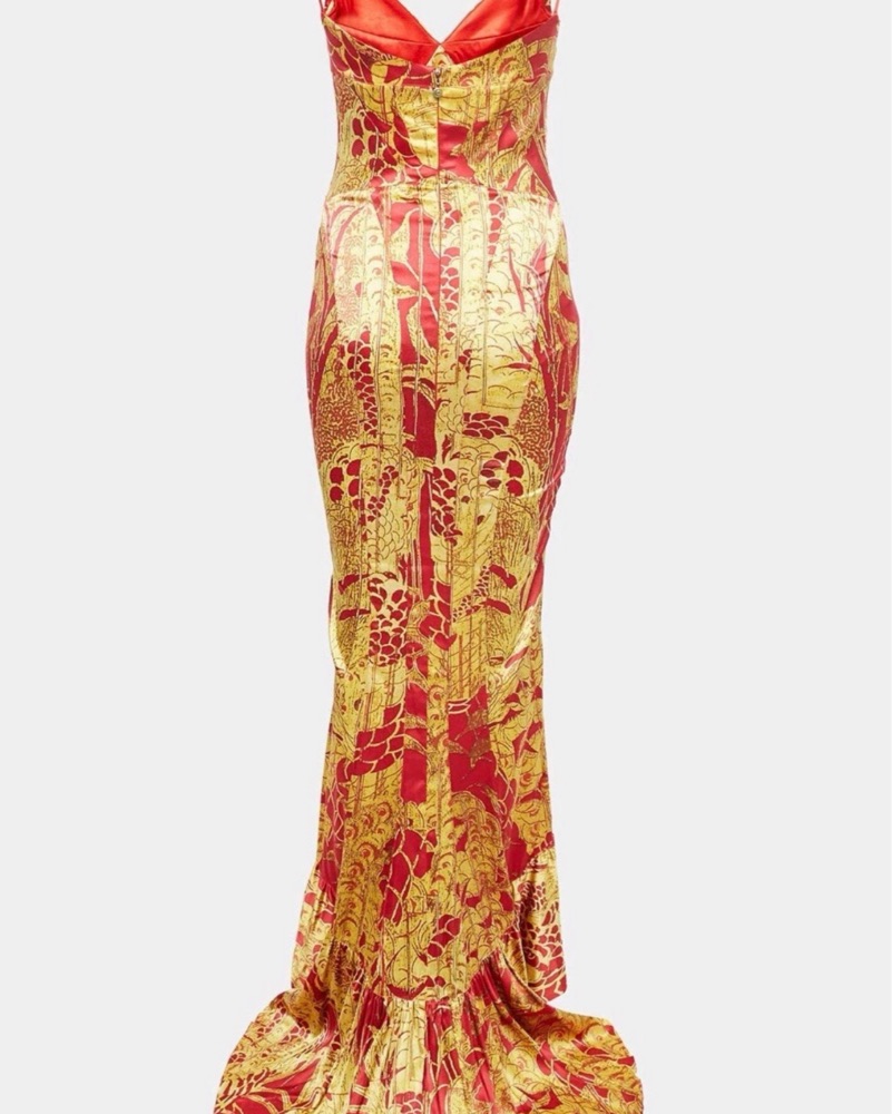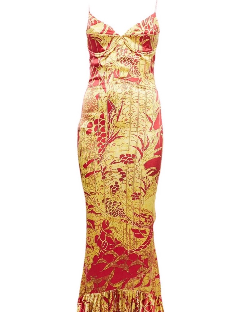 Red and gold, Japanese art print, US2-4. bust 32-36", waist 28-32", hips 36-40", length front 54”/back 60”