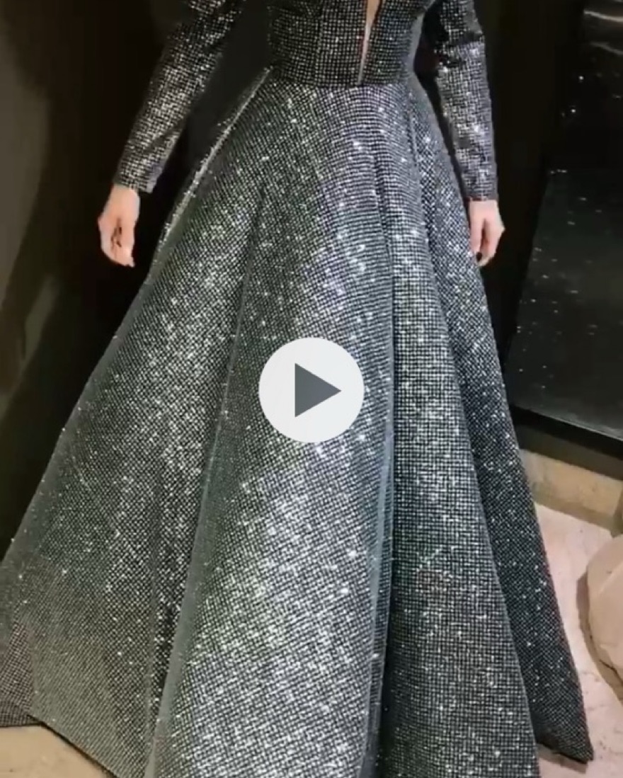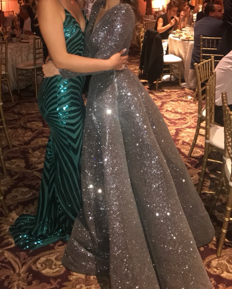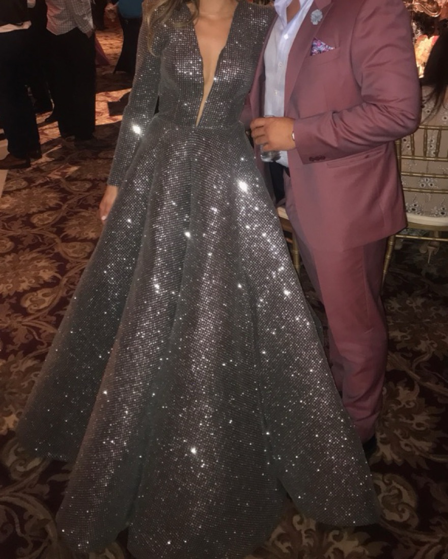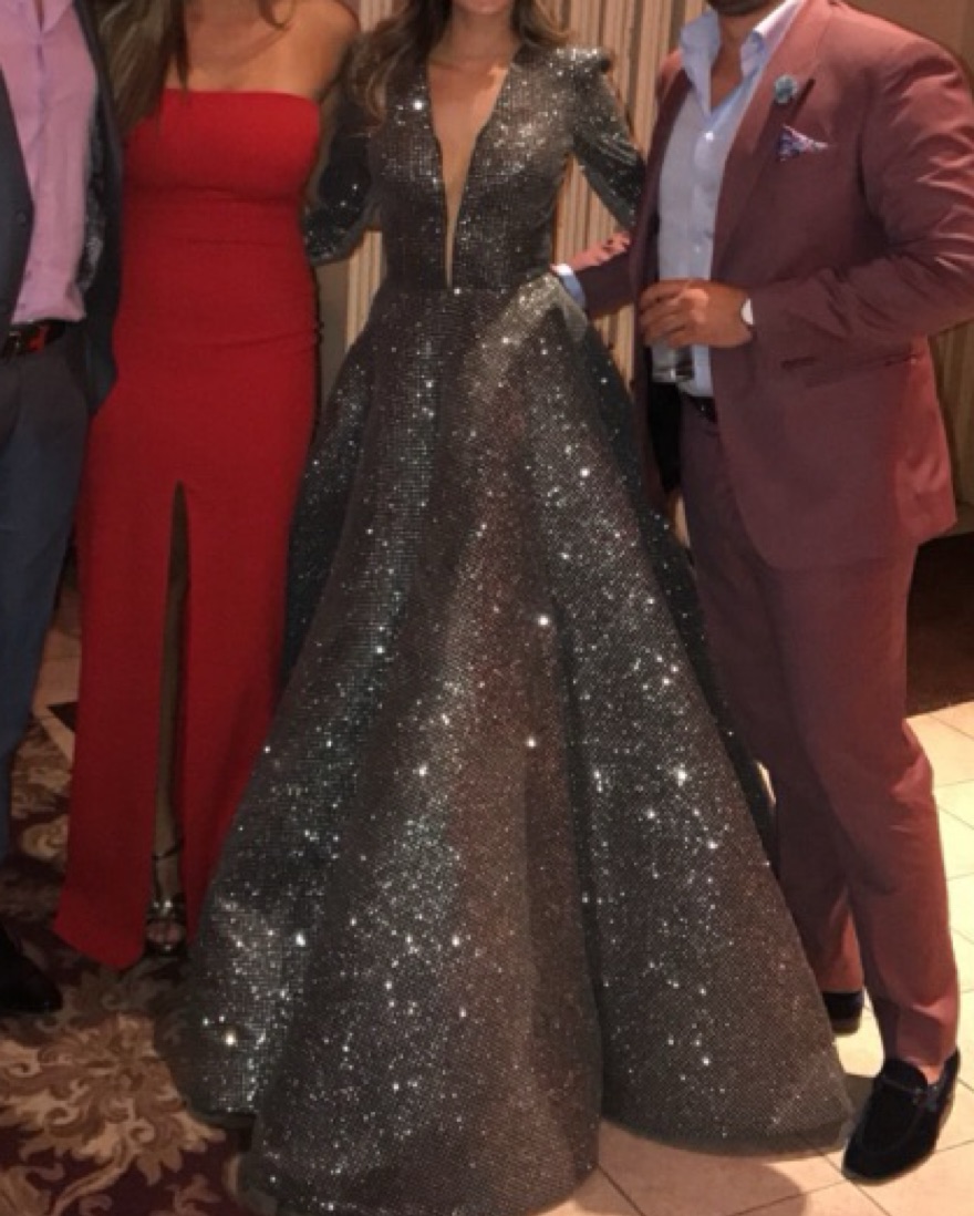 Custom-made gown,  plunge neckline with mesh zipper back closure. Super sparkly, beautiful piece. Black w/silver glitter, appears silver absolutely beautiful in person. Fits xs-s. / Height 5’6 + heels. I wore it to end of summer wedding and it was perfectly comfortable in air conditioned venue.