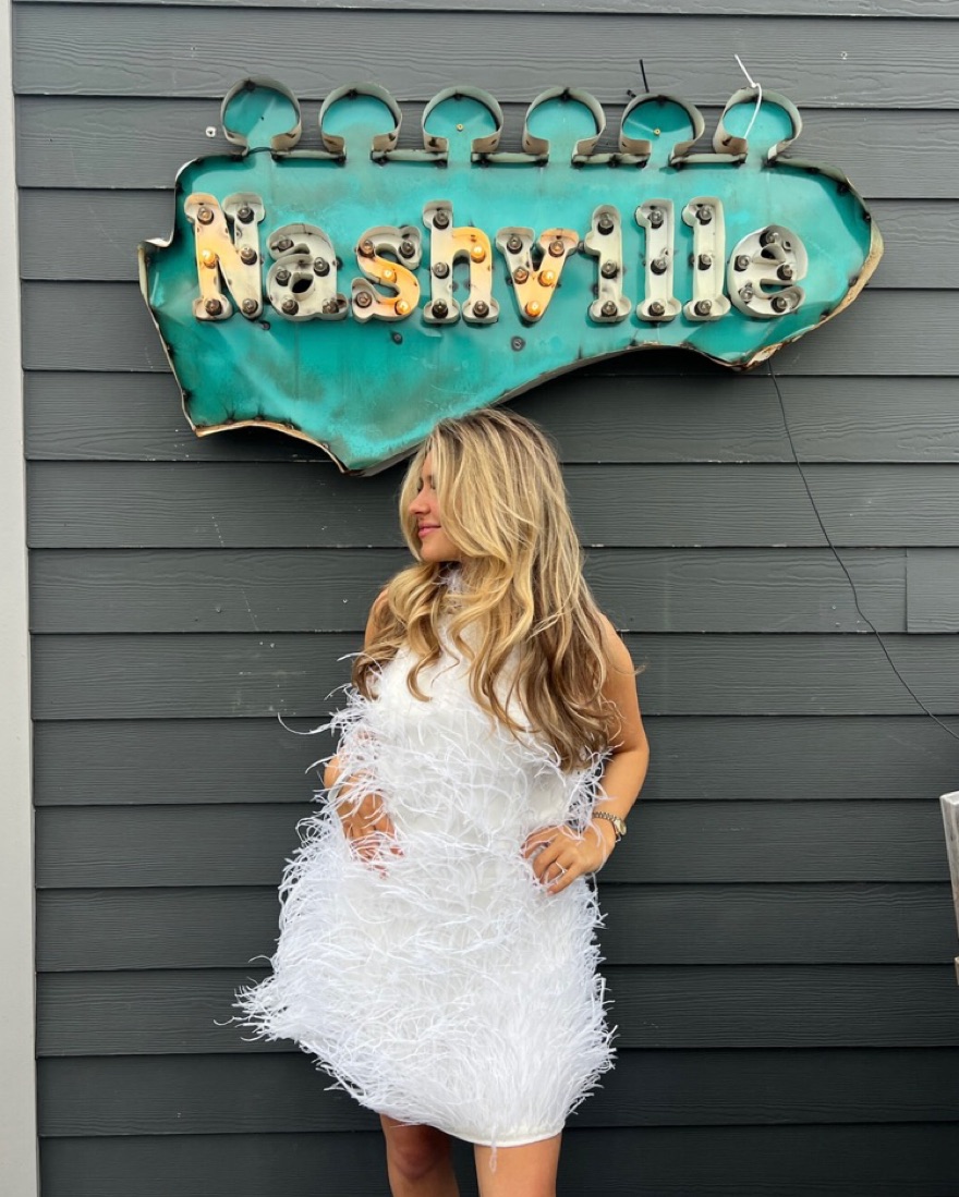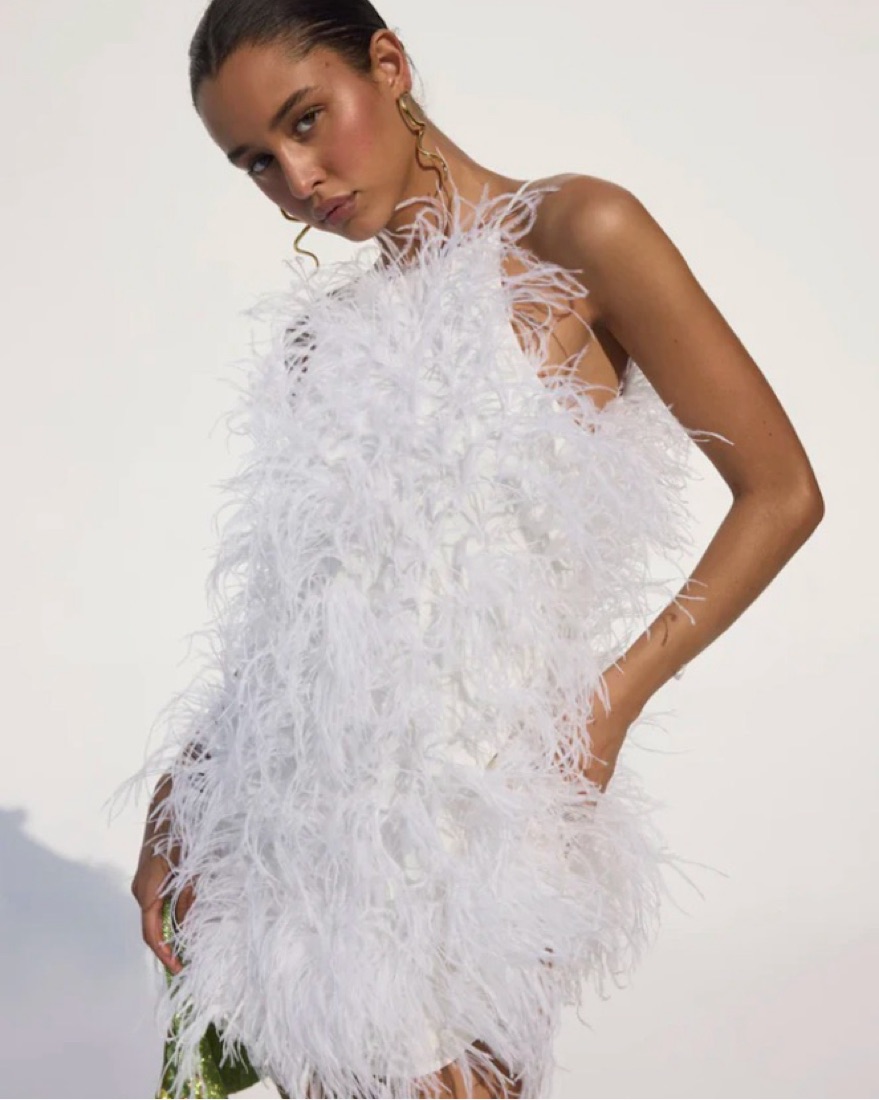 An A-line mini address adorned with wispy ostrich feathers. — Mini length — A-line silhouette — Zipper closure at back — Three-dimensional volume