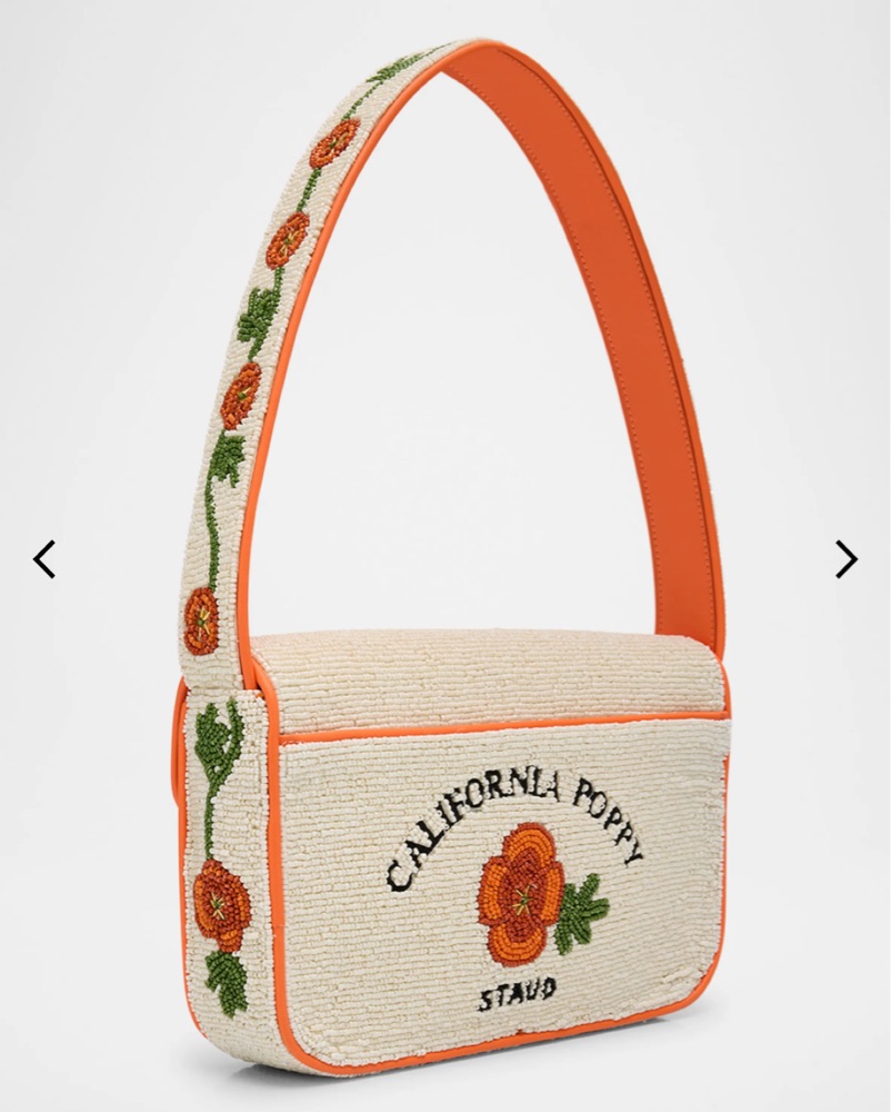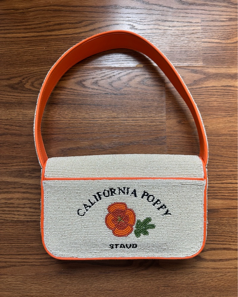 Orange beaded Staud Tommy bag featuring Staud’s Seed Shop and California Poppy.