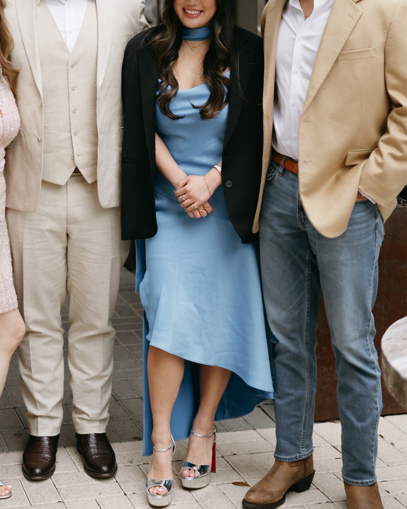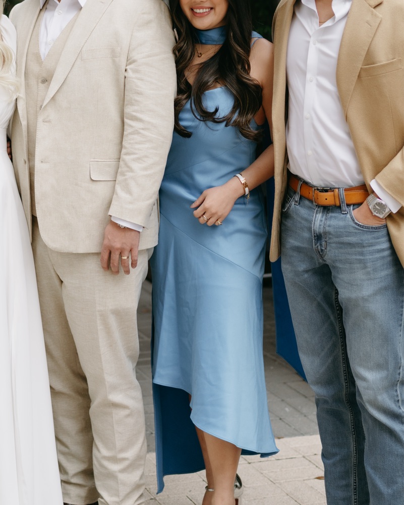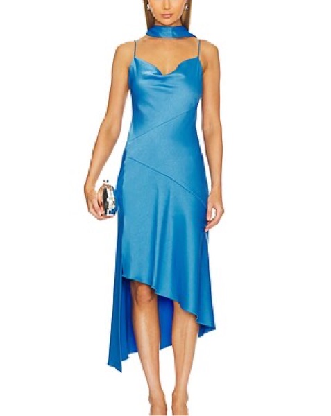 Alice + Olivia Harmony Asymmetrical Slip Scarf Dress. This stunning blue satin midi dress is perfect for a special occasion. The sleek and sophisticated silhouette flatters the figure beautifully.