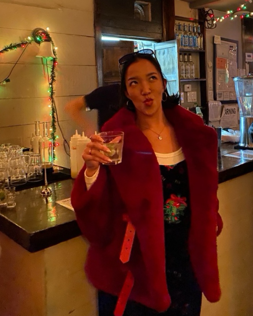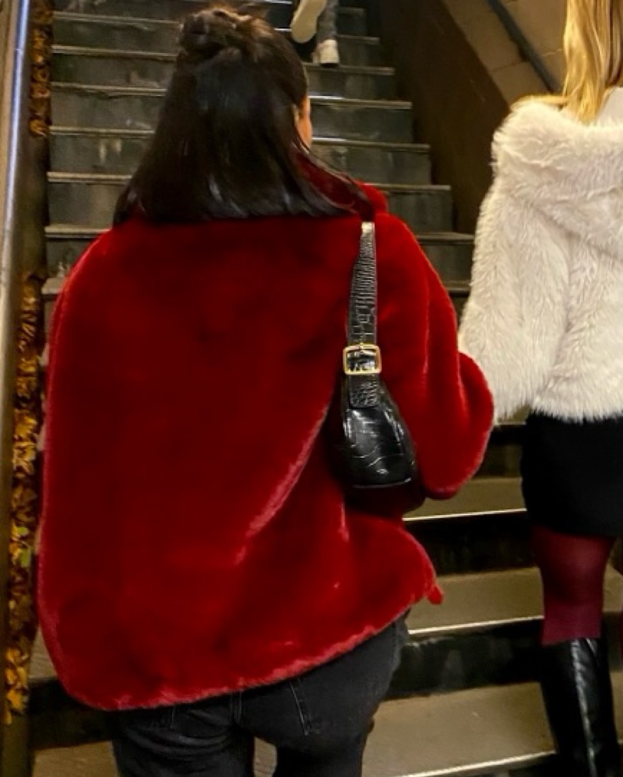 Red faux fur coat with double belt and pockets (unknown brand. Bought in Italy)