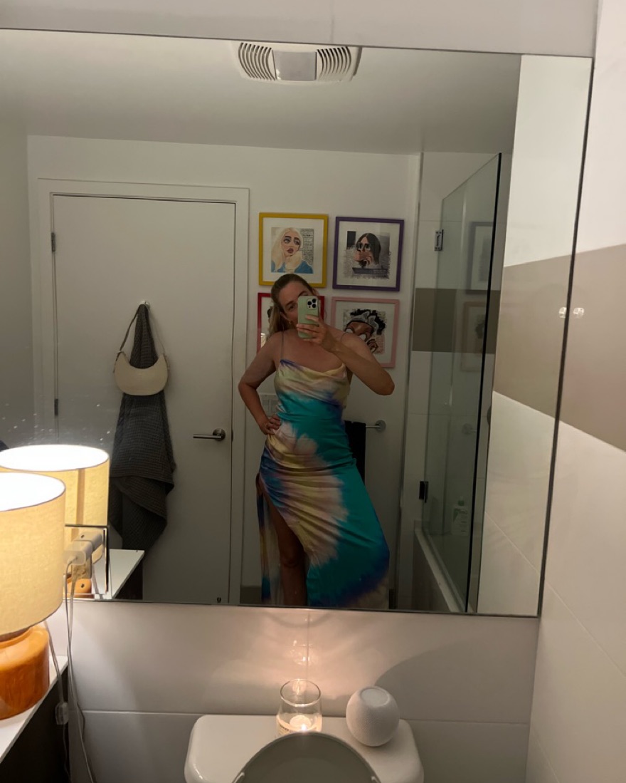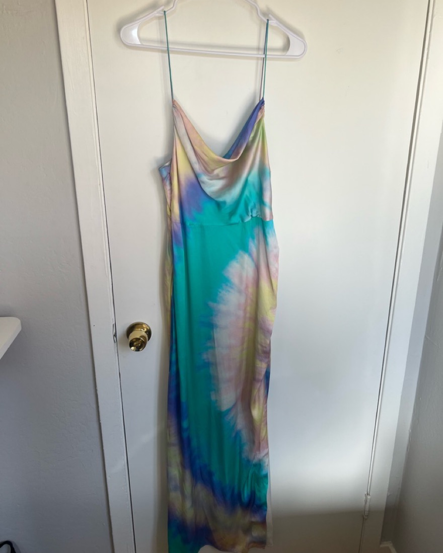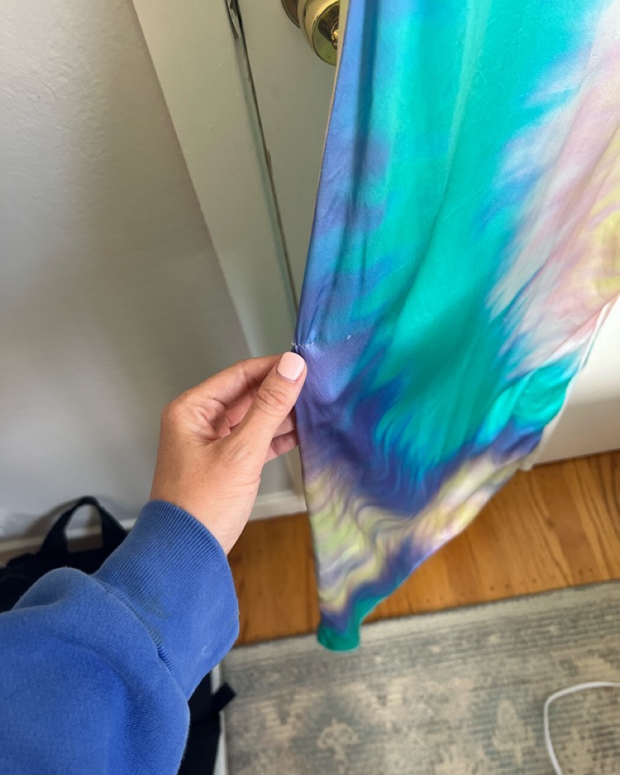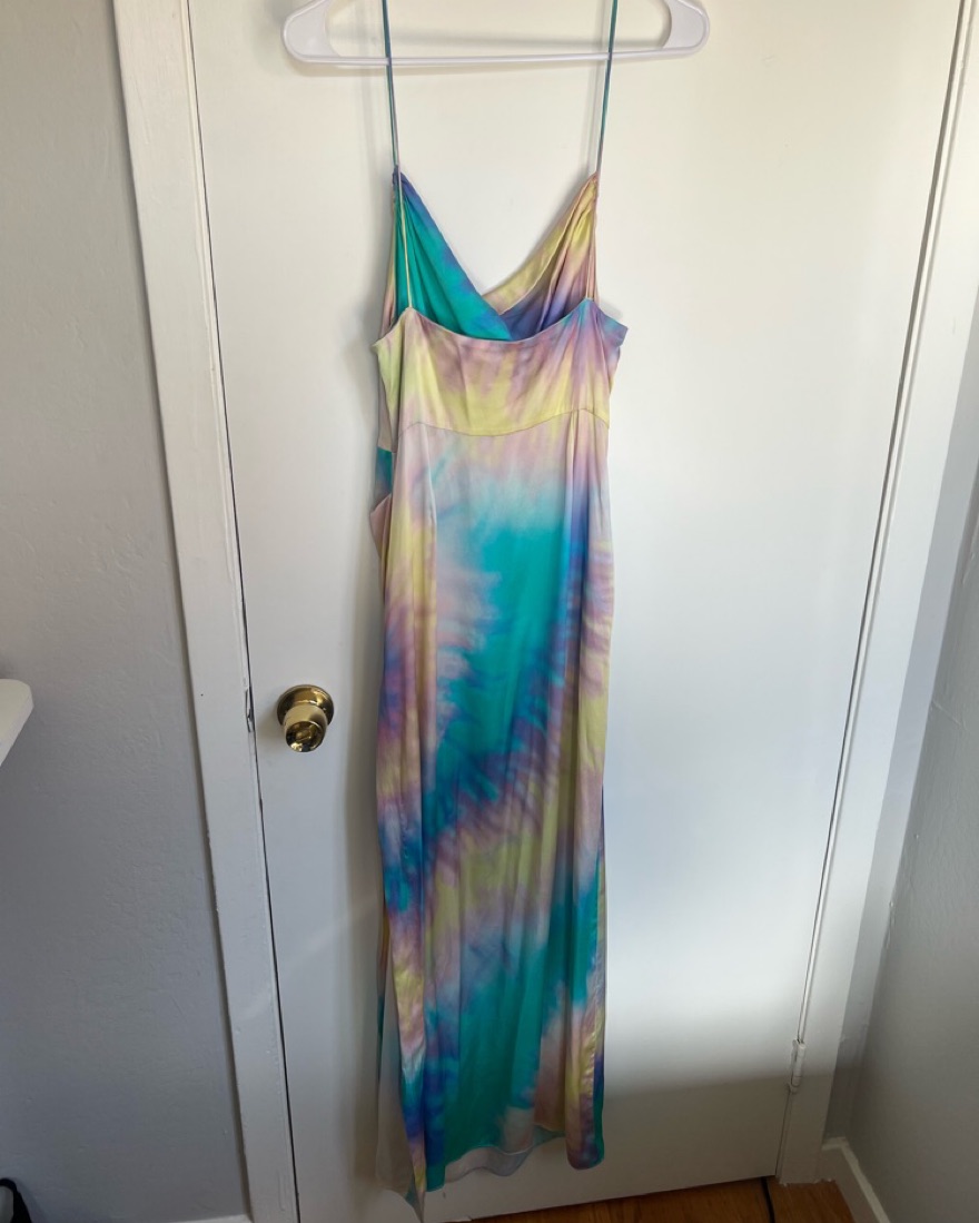 Very good condition this dress is so fun to wear. There is a small sewn piece on the slit pictured. Its so comfortable to wear as well!