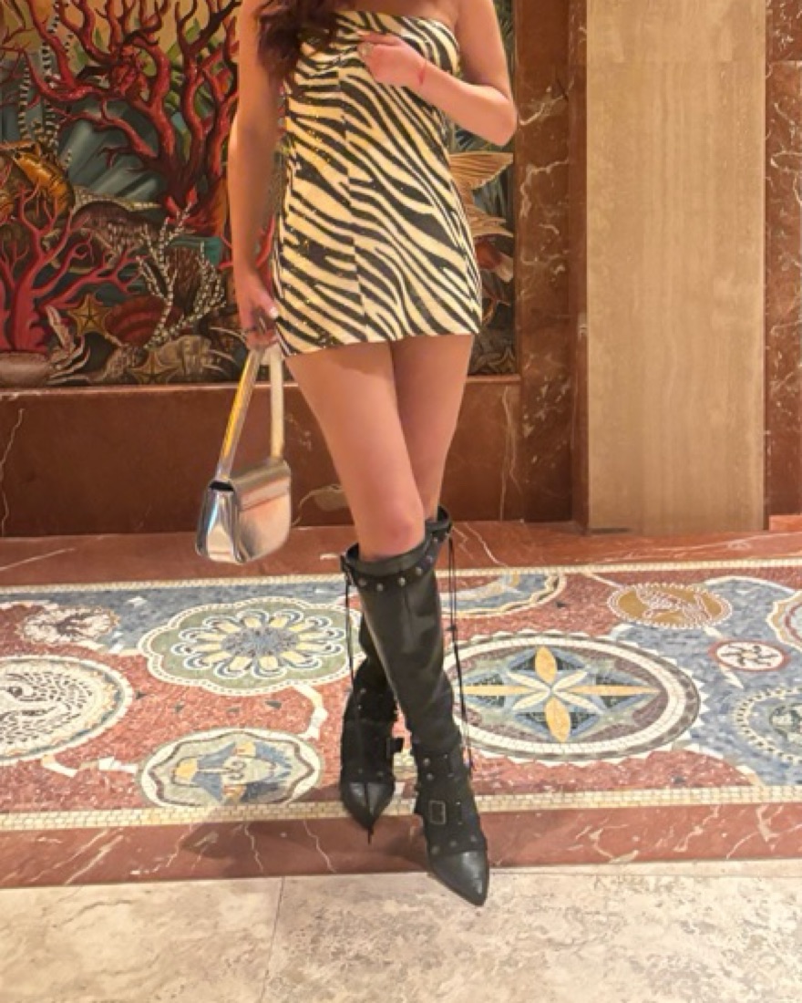 This bold and striking zebra print mini dress is perfect for a night out on the town. The figure-hugging silhouette and strapless design create a sultry, confident look.