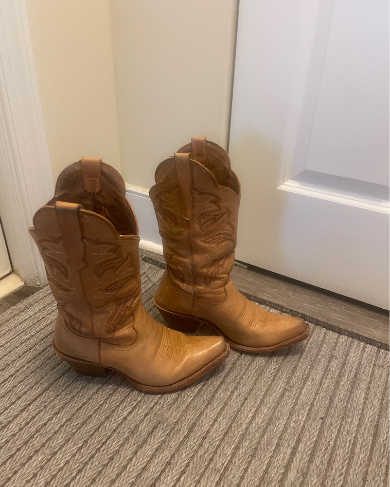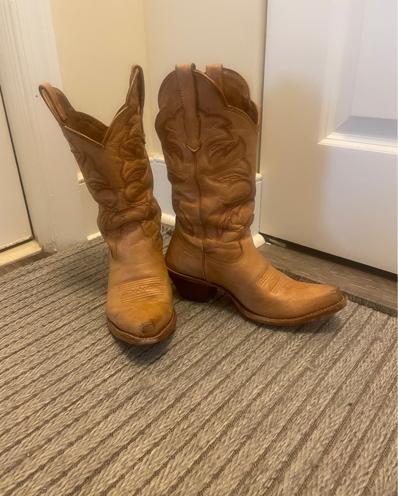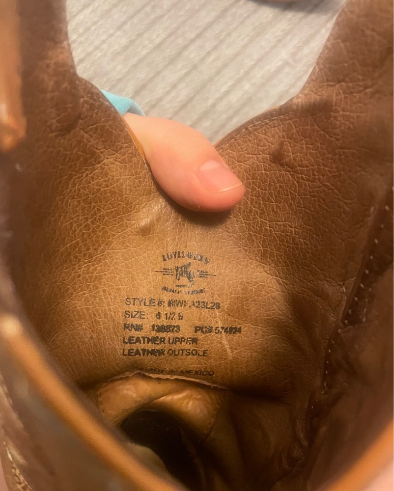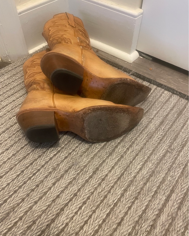 These are a size 6.5 (US Women’s). Exact product is: Hairpin Trigger Honey Western Boots - Snip Toe. Real leather sole which is great for dance floors, but not outdoor dancing.