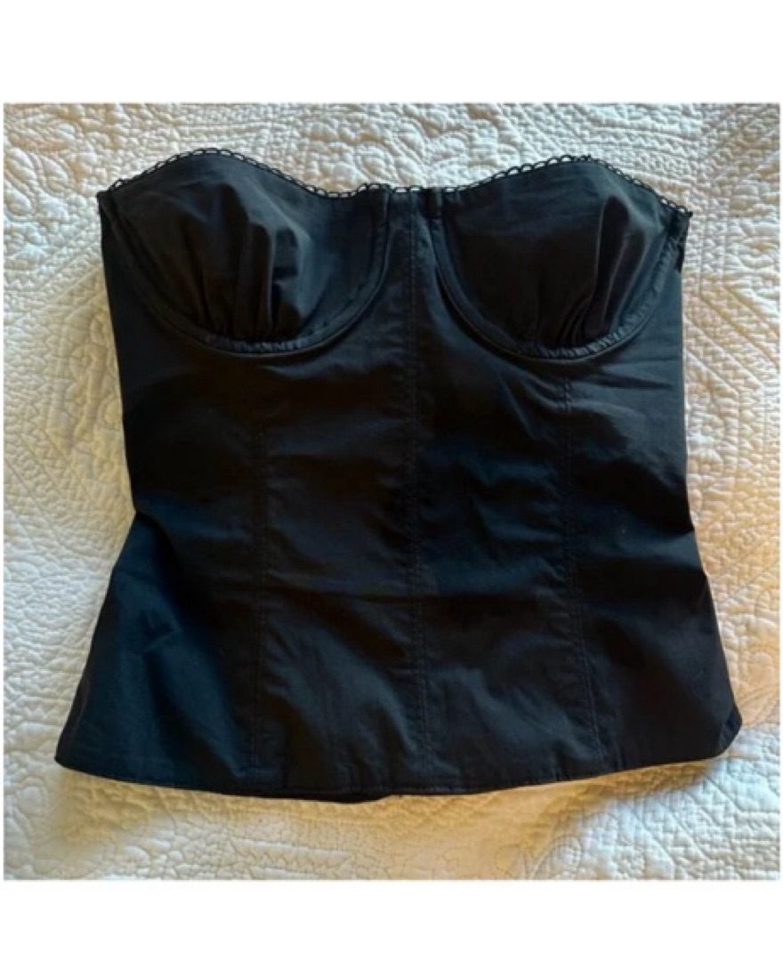 This black corset top is waist hugging and fitted. Runs small for a size 4.