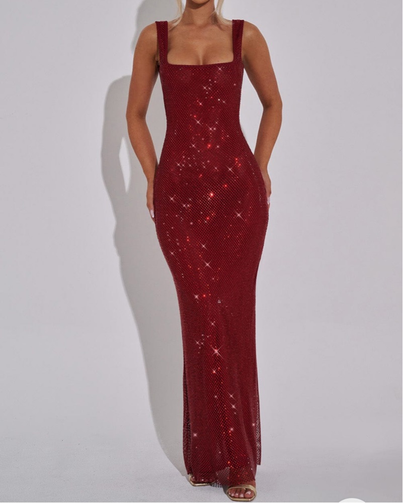 Get noticed in the stunning Petra Maxi Dress in a rich wine colour! Crafted from premium stretch net, this dress features hotfix rhinestone embellishments for a touch of glam. Fully lined with mesh, it offers a semi-sheer appearance and a flattering square neckline. The low scoop back and invisible