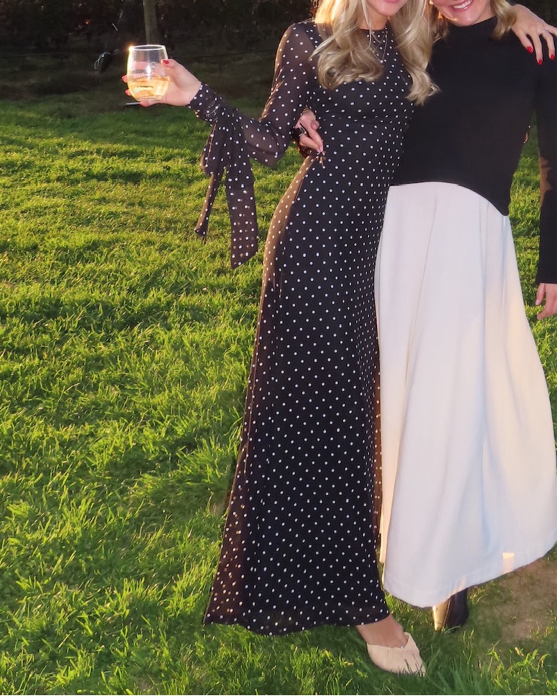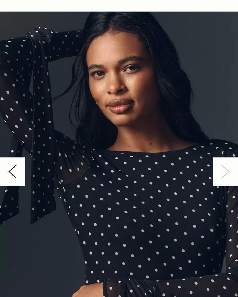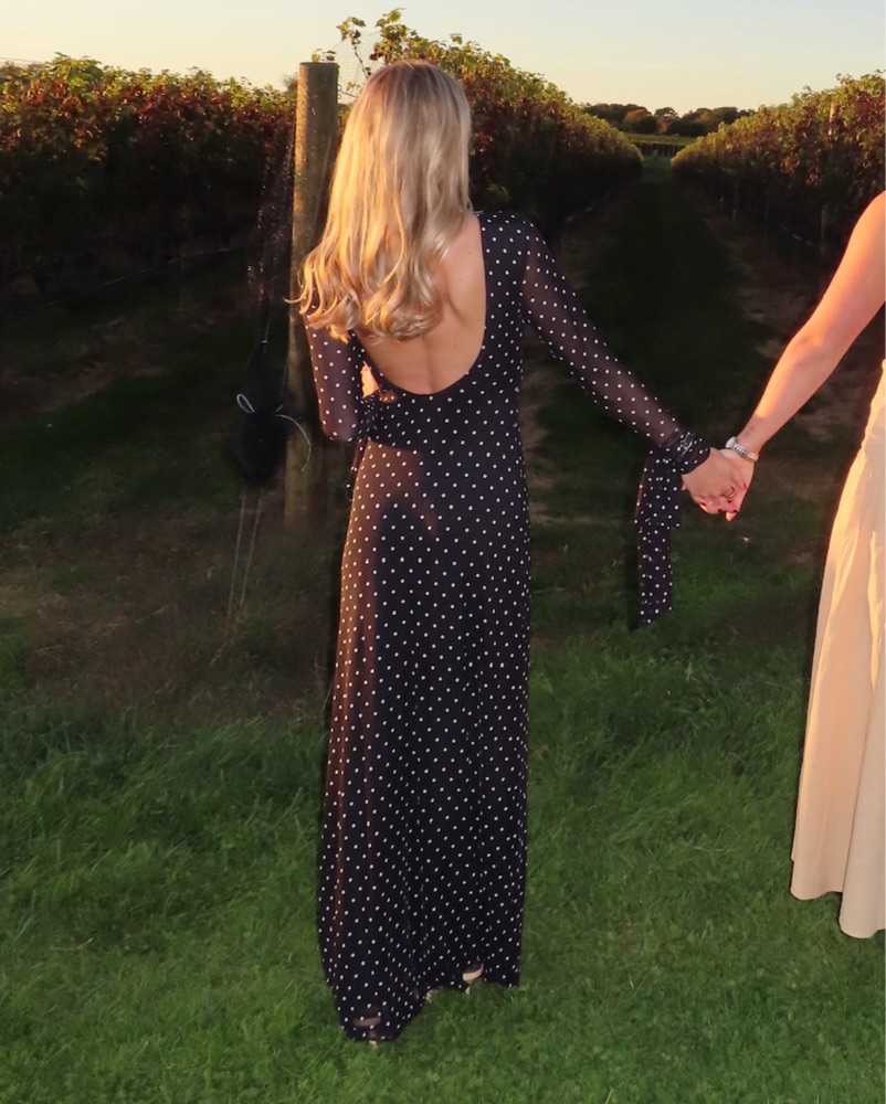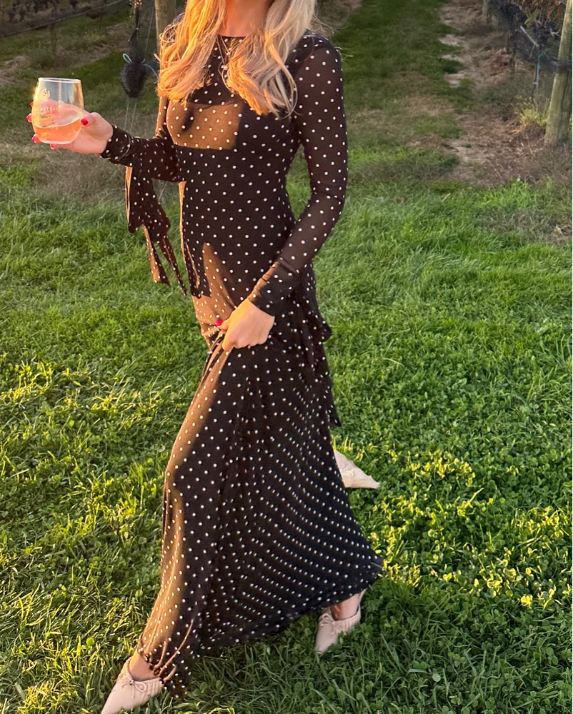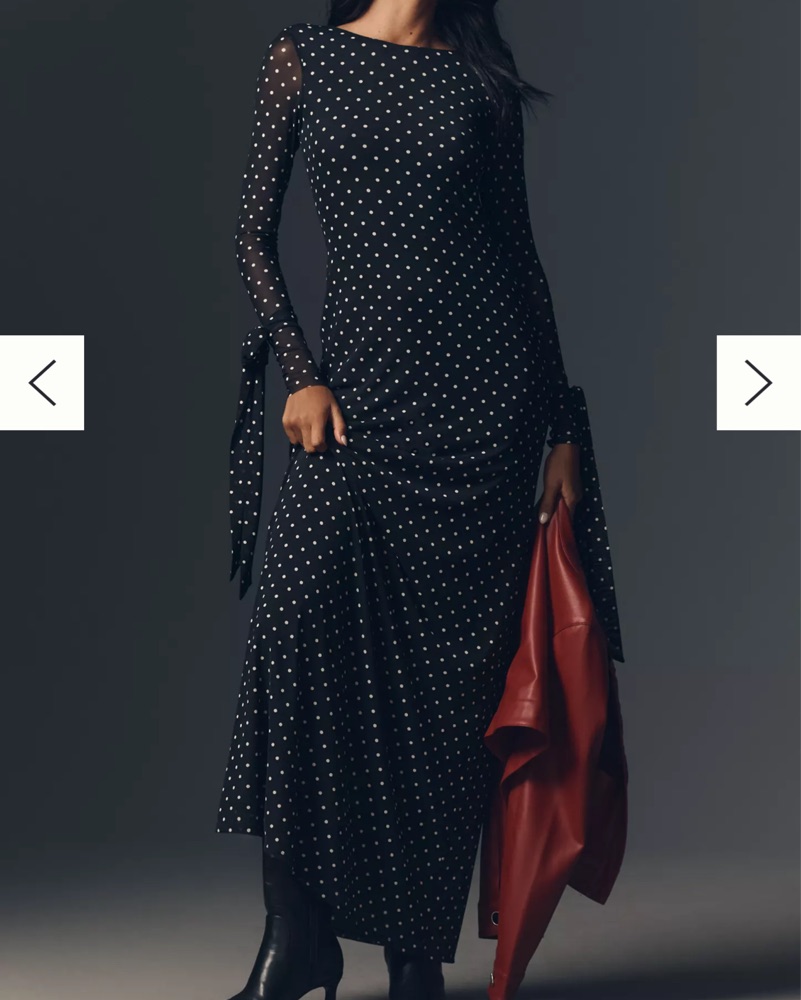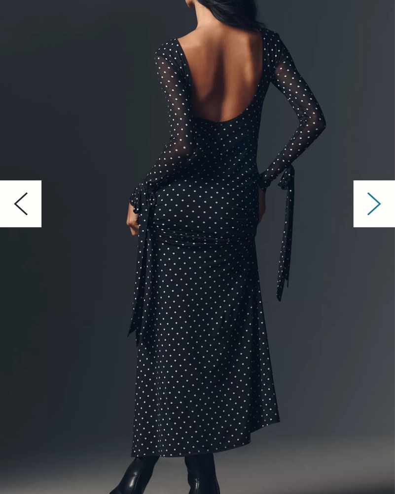 Sold out gorgeous, polka dot, mesh maxi dress with low back and ties on arms. Only the arms are see through, the rest is double lined. I got it hemmed to fit 5’3 with heels and it was still long.