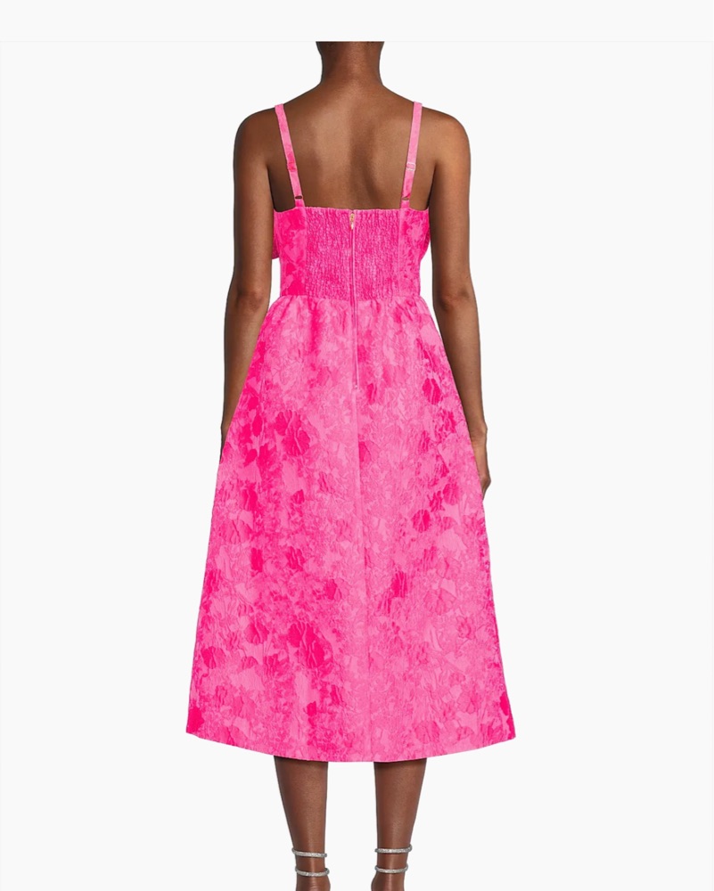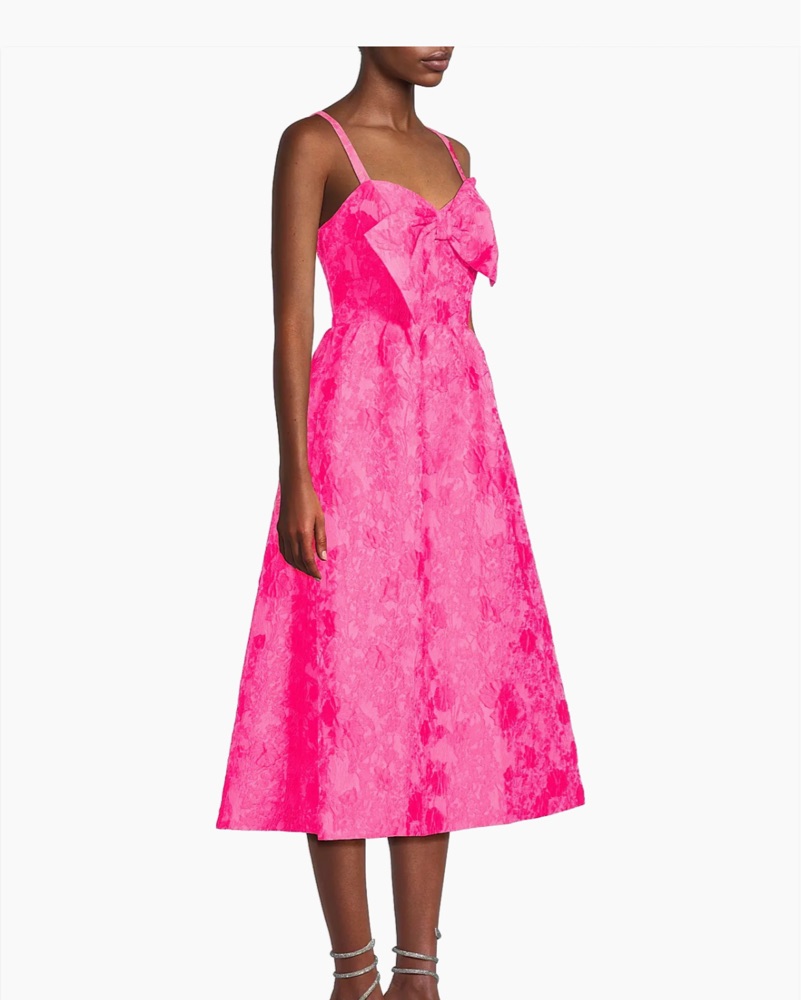 A large bow accents the bodice of this piece while adjustable straps and a smocked back panel lend added comfort.