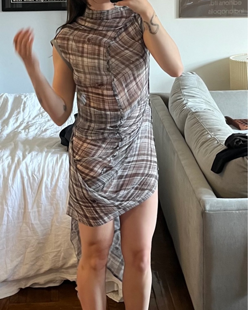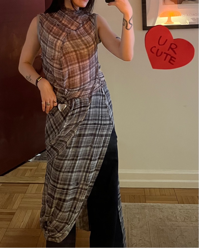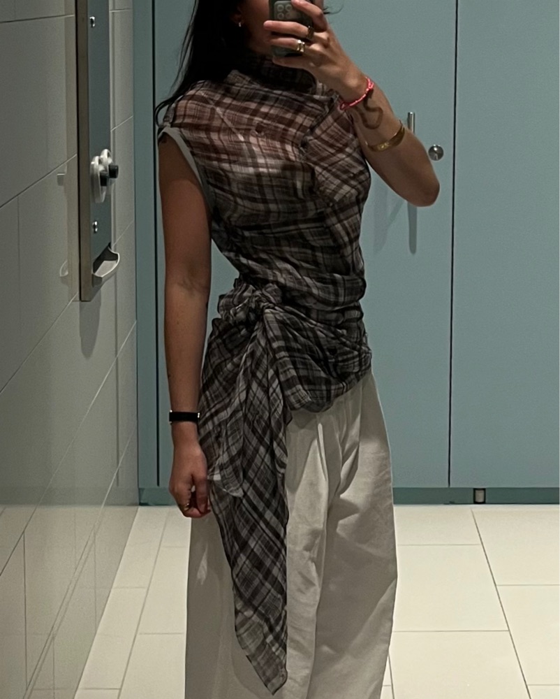 Twisted seam style with plaid screen printed on silk. Worn x2. Great layering piece. Can be pinned in interesting ways to make for different looks.